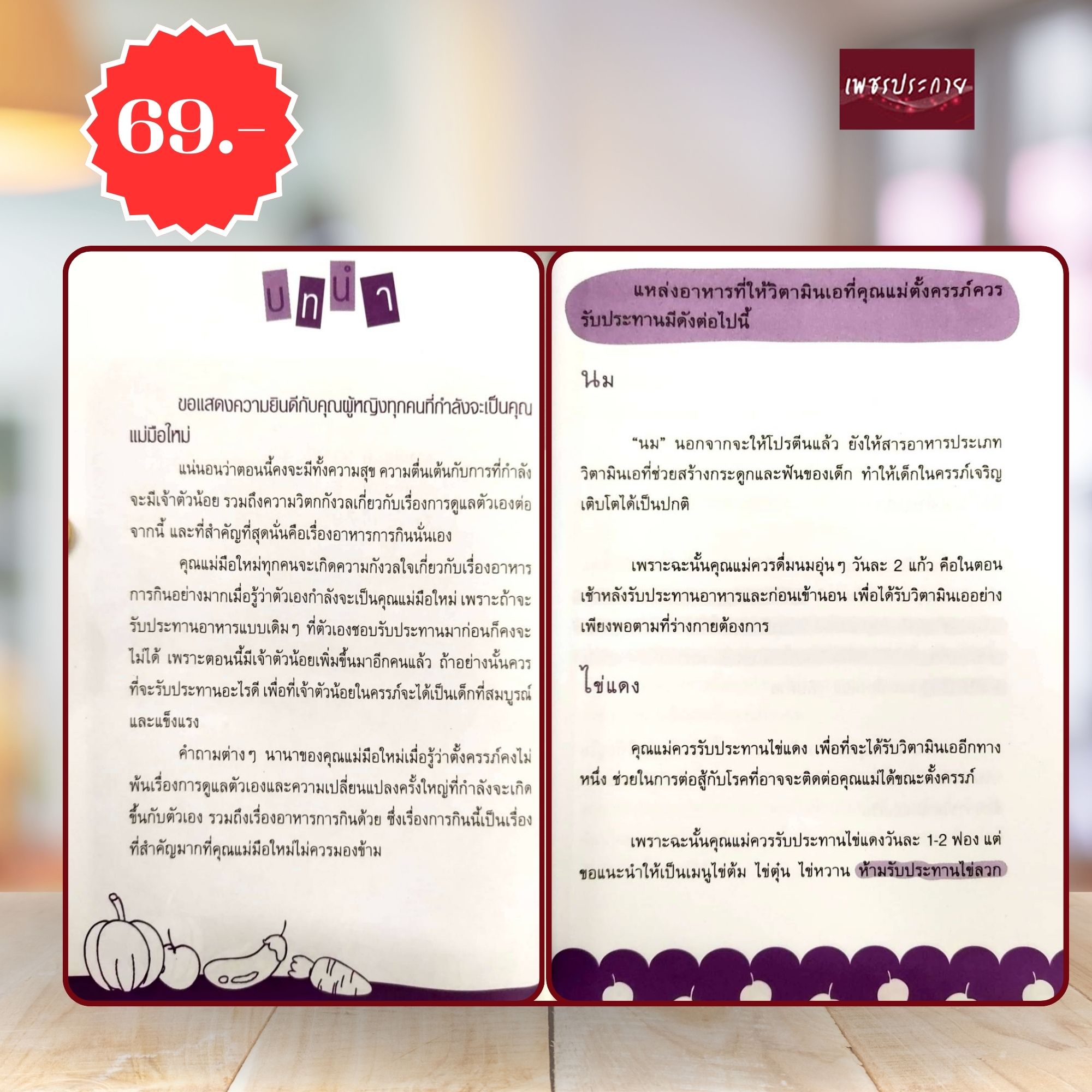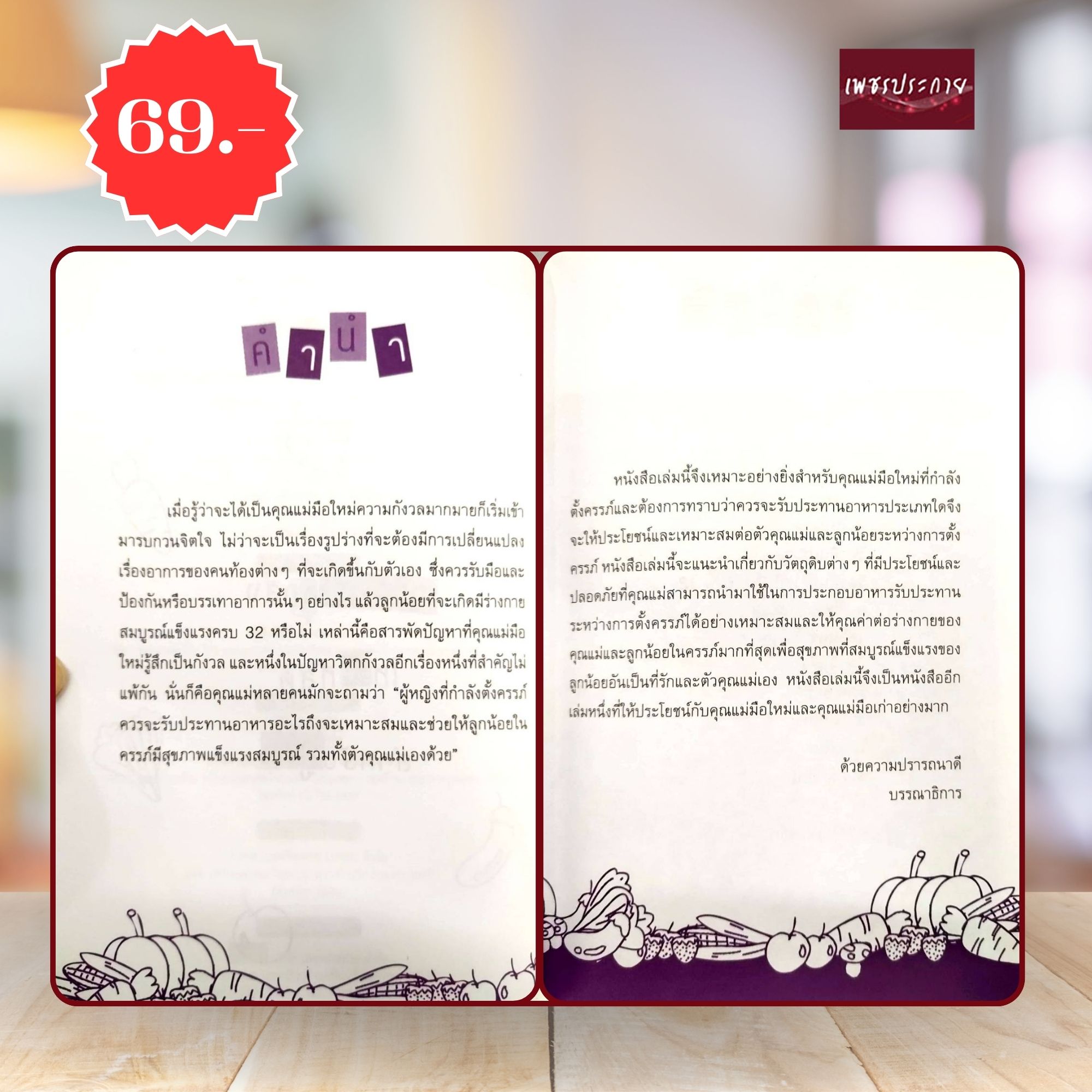 รวบรวมความรู้สำหรับคุณแม่มือใหม่ที่กำลังตั้งครรภ์ และต้องการทราบว่าควรจะรับประทานอาหารประเภทใด จึงจะให้ประโยชน์และเหมาะสมต่อตัวคุณเเม่และลูกน้อยระหว่างการตั้งครรภ์ ซึ่งในเล่มได้เเนะนำเกี่ยวกับวัตถุดิบต่าง ๆ ที่มีประโยชน์และปลอดภัย ซึ่งคุณแม่สามารถนำมาใช้ในการประกอบอาหารรับประทานระหว่างการตั้งครรภ์ได้อย่างเหมาะสม และให้คุณค่าต่อร่างกายของคุณแม่และลูกน้อยในครรภ์มากที่สุด เพื่อสุขภาพที่สมบูรณ์แข็งแรงของลูกน้อยอันเป็นที่รักและตัวคุณแม่เอง![]() ![]() ![]() ![]() ![]() ![]() ![]() ![]() |