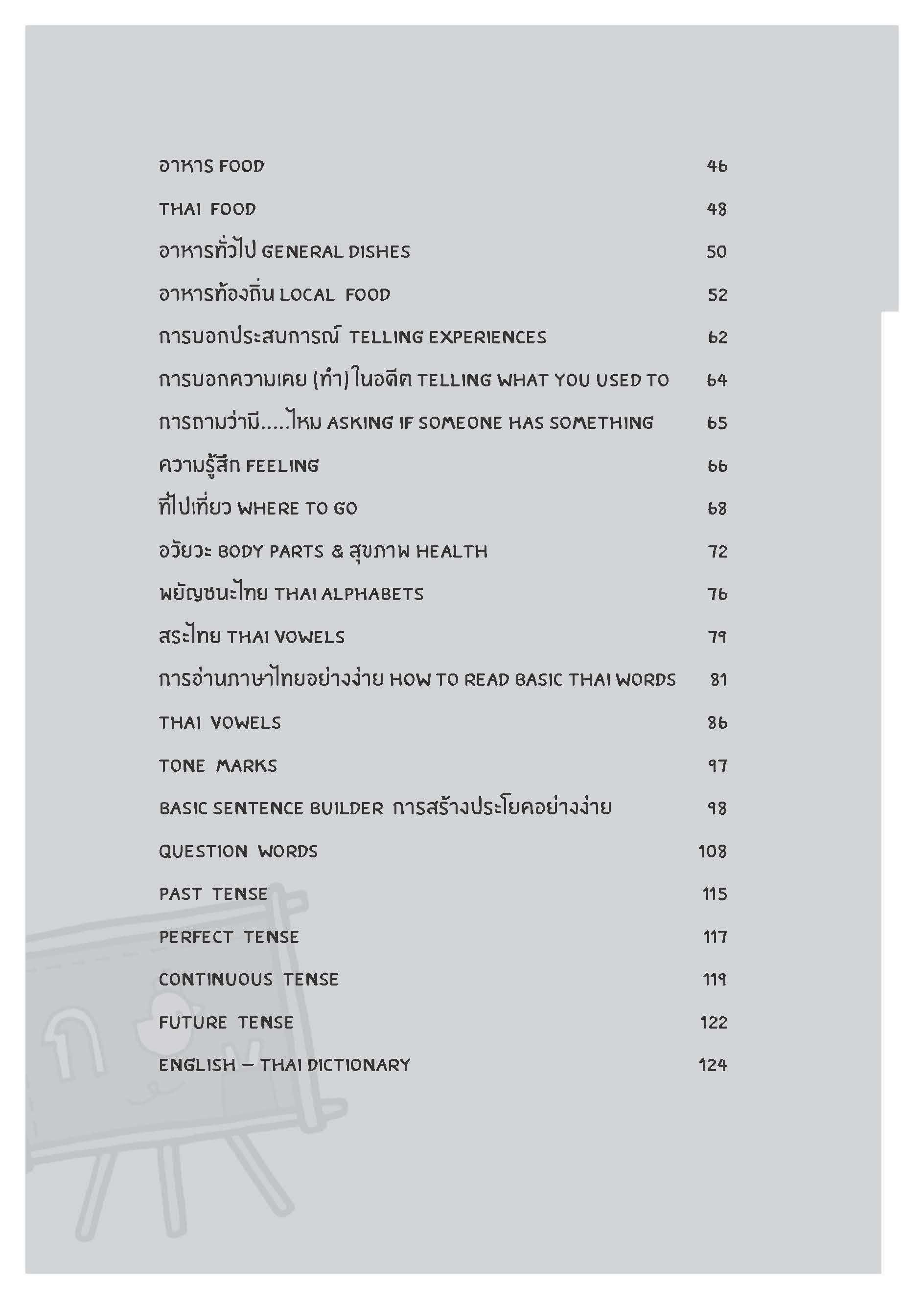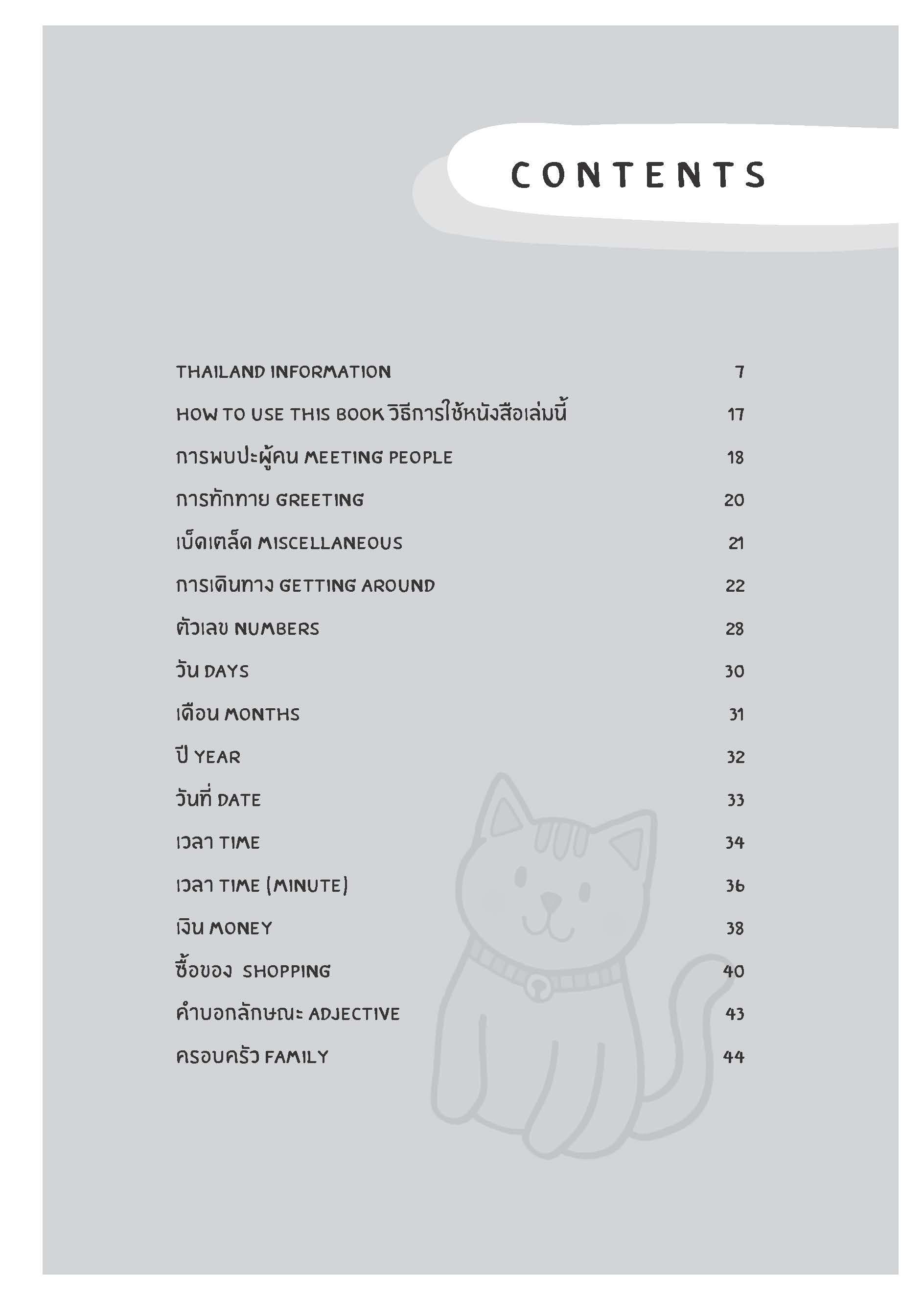 โดยเนื้อหาภายในเล่มจะเริ่มสอนด้วยหลักการ "ฟัง พูด อ่าน เขียน" สำหรับการฟังนั้น ผู้อ่านที่ต้องการเรียนรู้ภาษาไทยจะต้องฝึกฟังคนไทยพูดมาก ๆ และมาเสริมสร้างความแข็งแรงของการพูดภาษาไทย โดยในส่วนของการอ่านนั้น จะมีการฝึกให้หัดสะกดคำภาษาไทยด้วยภาษาคาราโอเกะในหนังสือเล่มนี้ และในท้ายเล่มจะมีคำศัพท์ภาษาไทยแบ่งเป็นหมวดหมู่ A-Z ให้ผู้อ่านได้ฝึกอ่านและนำไปใช้พูดสื่อสารกับคนไทย ![]() ![]() ![]() ![]() ![]() ![]() ![]() ![]() ![]() ![]() ![]() ![]() ![]() ![]() ![]() ![]() |