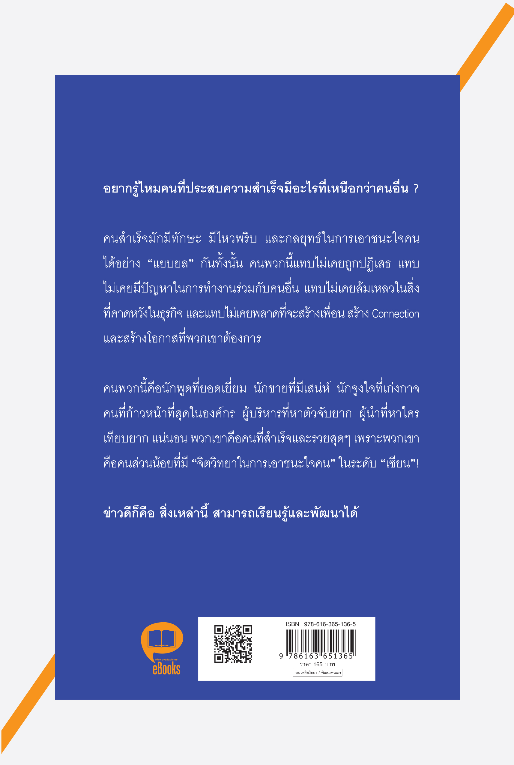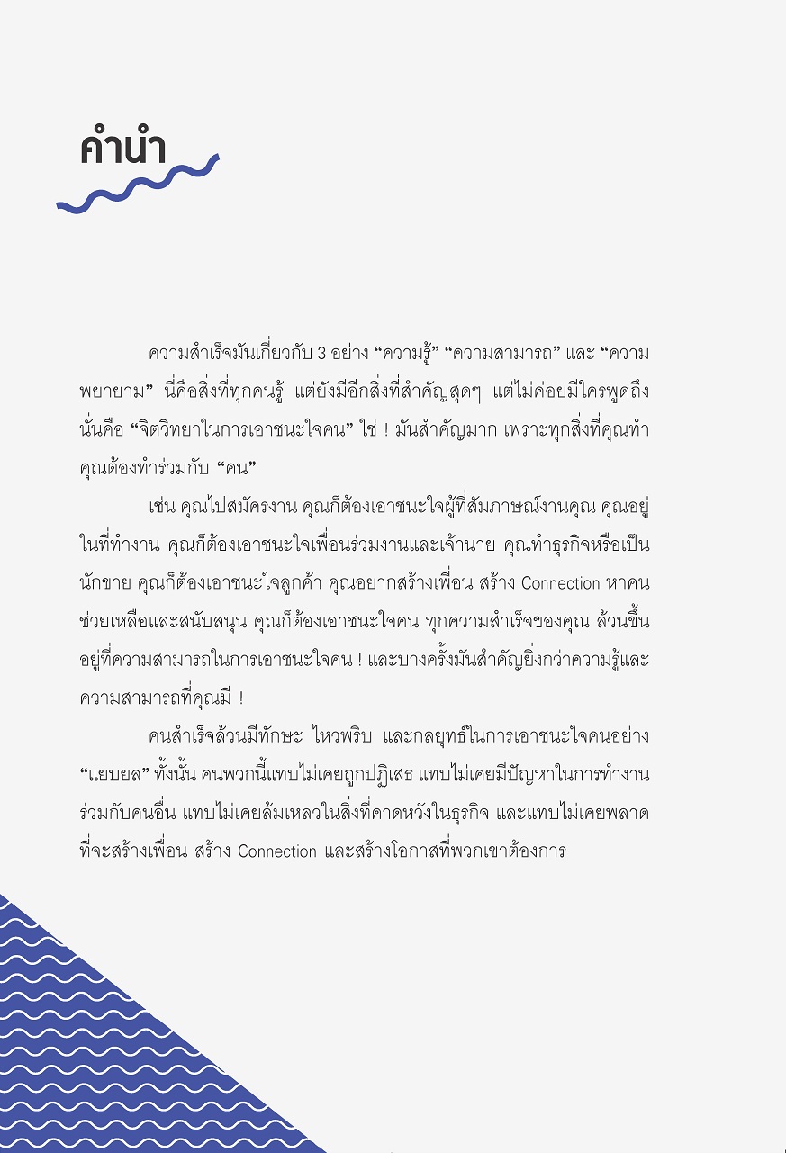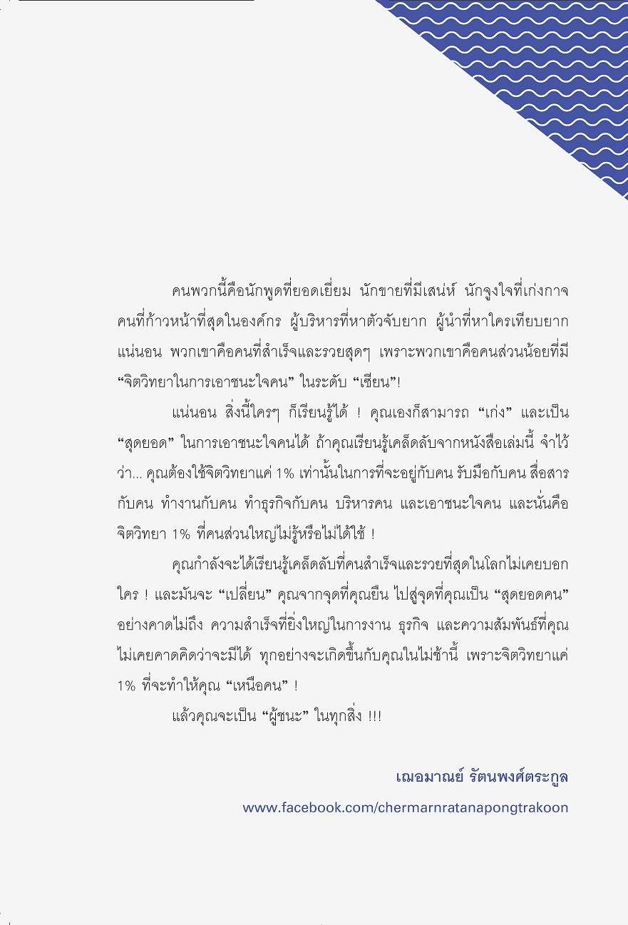 สำนักพิมพ์ Double Days ผู้แต่ง เฌอมาณย์ รัตนพงศ์ตระกูล จำนวน 176 หน้า ขนาด 14.5 x 21 x 1.2 C.m กระดาษปอนด์ 80 แกรม พิมพ์ 2 สีทั้งเล่ม คนสำเร็จมักมีทักษะ มีไหวพริบ และกลยุทธ์ในการเอาชนะใจคนได้อย่าง "แยบยล" กันทั้งนั้น คนพวกนี้แทบไม่เคยปฎิเสธ แทบไม่เคยมีปัญหาในการทำงานร่วมกับผู้อื่น แทบไม่เคยล้มเหลวในสิ่งที่คาดหวังในธุรกิจ และแทบไม่เคยพลาดที่จะสร้างเพื่อน สร้าง Connection และสร้างโอกาสที่พวกเขาต้องการ คนพวกนี้คือนักพูดที่ยอดเยี่ยม นักขายที่มีเสน่ห์ นักจูงใจที่เก่งกาจ คนที่ก้าวหน้าที่สุดในองค์กร ผู้บริหารที่หาตัวจับยาก ผู้นำที่หาใครเทียบยาก แน่นอน พวกเขาคือคนที่สำเร็จและรวยสุดๆ เพราะพวกเขาคือคนส่วนน้อยที่มี "จิตวิทยาในการเอาชนะใจคน" ในระดับเซียน "ข่าวดีก็คือ สิ่งเหล่านี้สามารถเรียนรู้และพัฒนาได้"![]() ![]() ![]() ![]() ![]() ![]() ![]() ![]() ![]() ![]() ![]() ![]() ![]() ![]() ![]() ![]() ![]() ![]() |