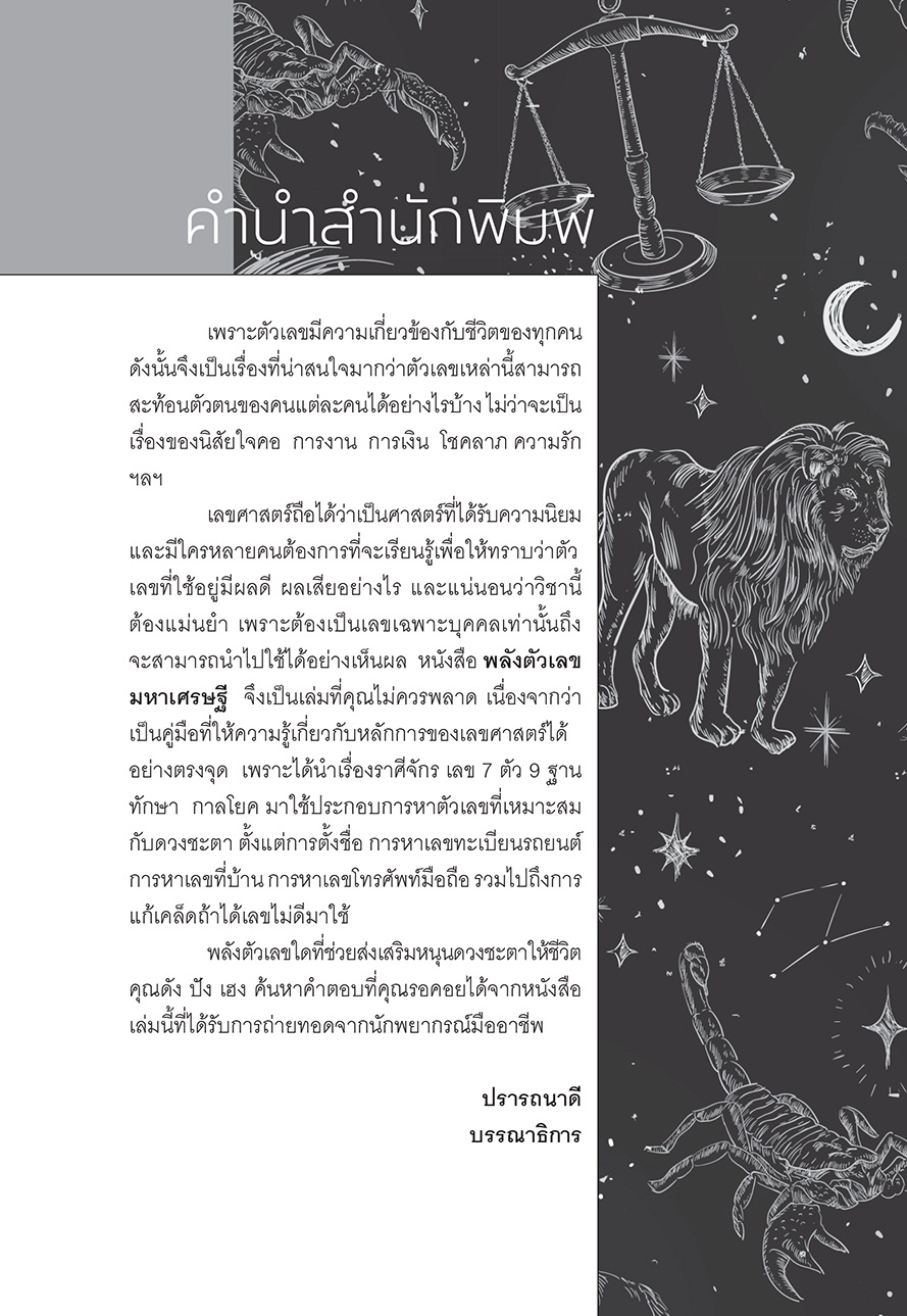 เรื่อง  พลังตัวเลขมหาเศรษฐี  เล่มนี้ ท่านผู้อ่านจะได้เรียนรู้ความหมายของพลังตัวเลขที่เป็นมงคล  และไม่เป็นมงคล