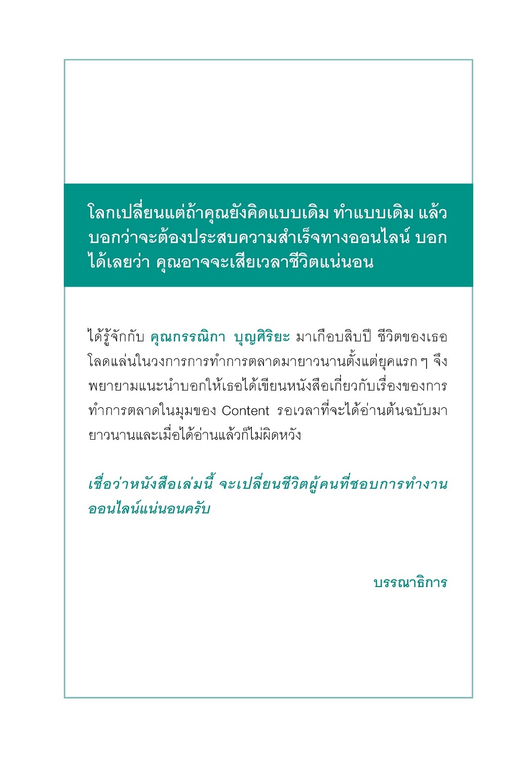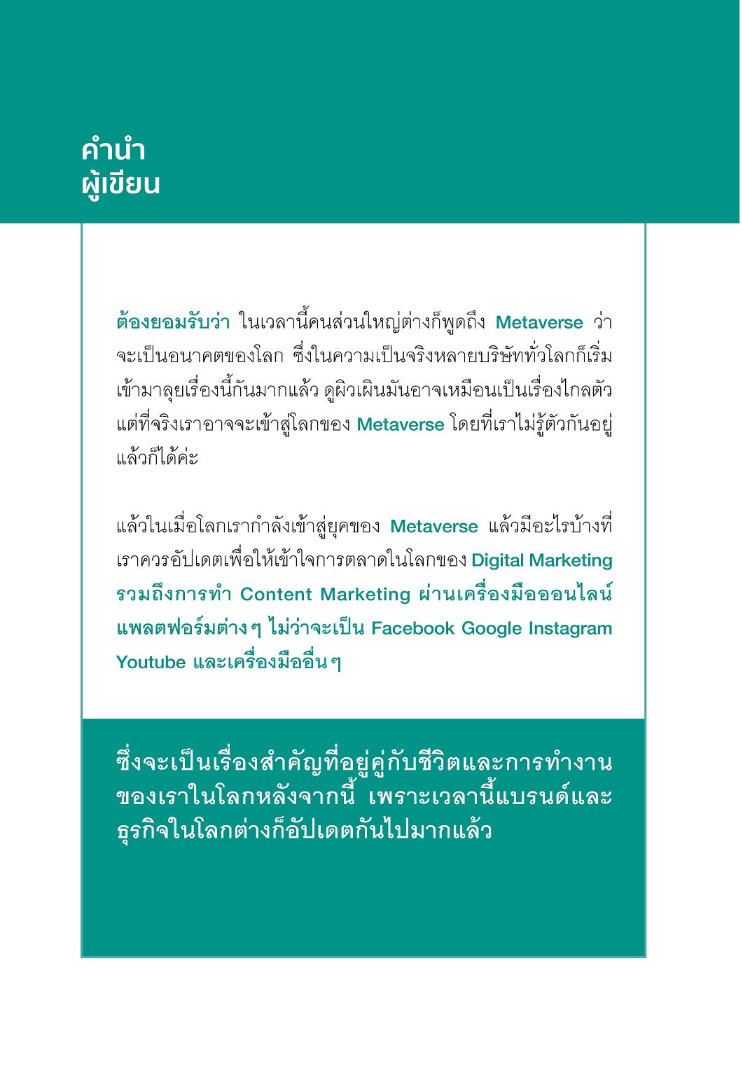 ต้องยอมรับว่า ในเวลานี้คนส่วนใหญ่ต่างก็พูดถึง Metaverse ว่าจะเป็นอนาคตของโลก ซึ่งในความเป็นจริงหลายบริษัททั่วโลกก็เริ่มเข้ามาลุยเรื่องนี้กันมากแล้ว ดูผิวเผินมันอาจเหมือนเป็นเรื่องไกลตัว แต่ที่จริงเราอาจจะเข้าสู่โลกของ Metaverse โดยที่เราไม่รู้ตัวกันอยู่แล้วก็ได้ แล้วในเมื่อโลกเรากำลังเข้าสู่ยุคของ Metaverse แล้วมีอะไรบ้างที่เราควรอัปเดตเพื่อให้เข้าใจการตลาดในโลกของ Digital Marketing รวมถึงการทำ Content Marketing ผ่านเครื่องมือออนไลน์แพลตฟอร์มต่างๆ ไม่ว่าจะเป็น Facebook Google Instagram Youtube และเครื่องมืออื่นๆ ซึ่งจะเป็นเรื่องสำคัญที่อยู่คู่กับชีวิตและการทำงานของเราในโลกหลังจากนี้ เพราะเวลานี้แบรนด์และธุรกิจในโลกต่างก็อัปเดตกันไปมากแล้ว เชื่อว่าหนังสือเล่มนี้ จะเปลี่ยนชีวิตผู้คนที่ชอบการทำงานออนไลน์ได้แน่นอน ![]() ![]() ![]() ![]() ![]() ![]() ![]() ![]() ![]() ![]() ![]() ![]() ![]() ![]() ![]() ![]() |