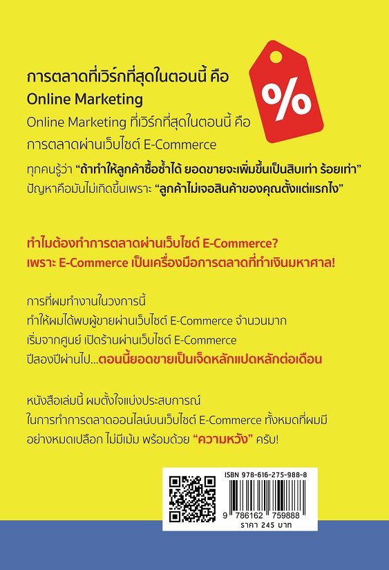 หนังสือเล่มนี้ผู้เขียนตั้งใจแบ่งปันประสบการณ์ในการทำการตลาดออนไลน์บนเว็บไซต์ E-commerce