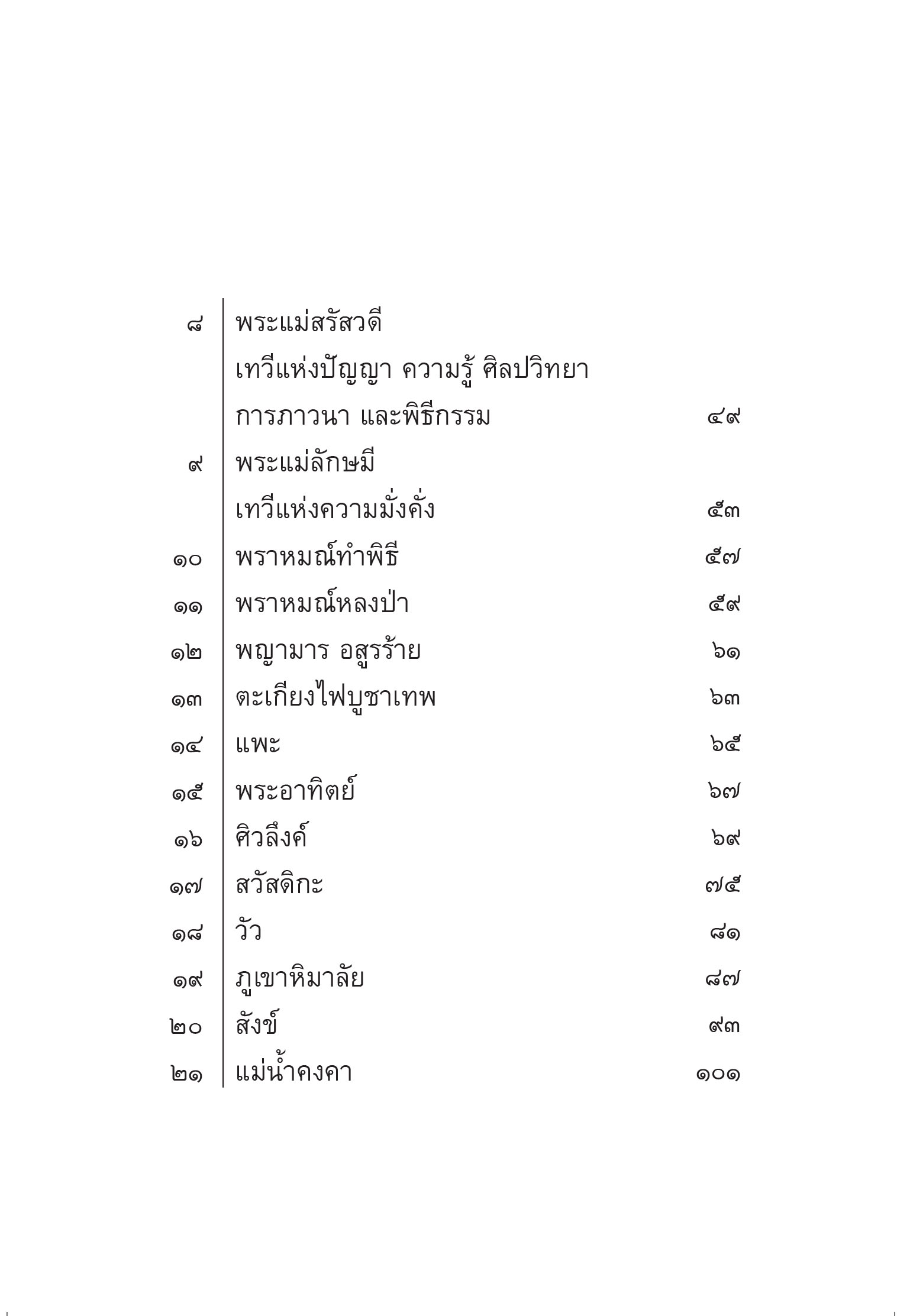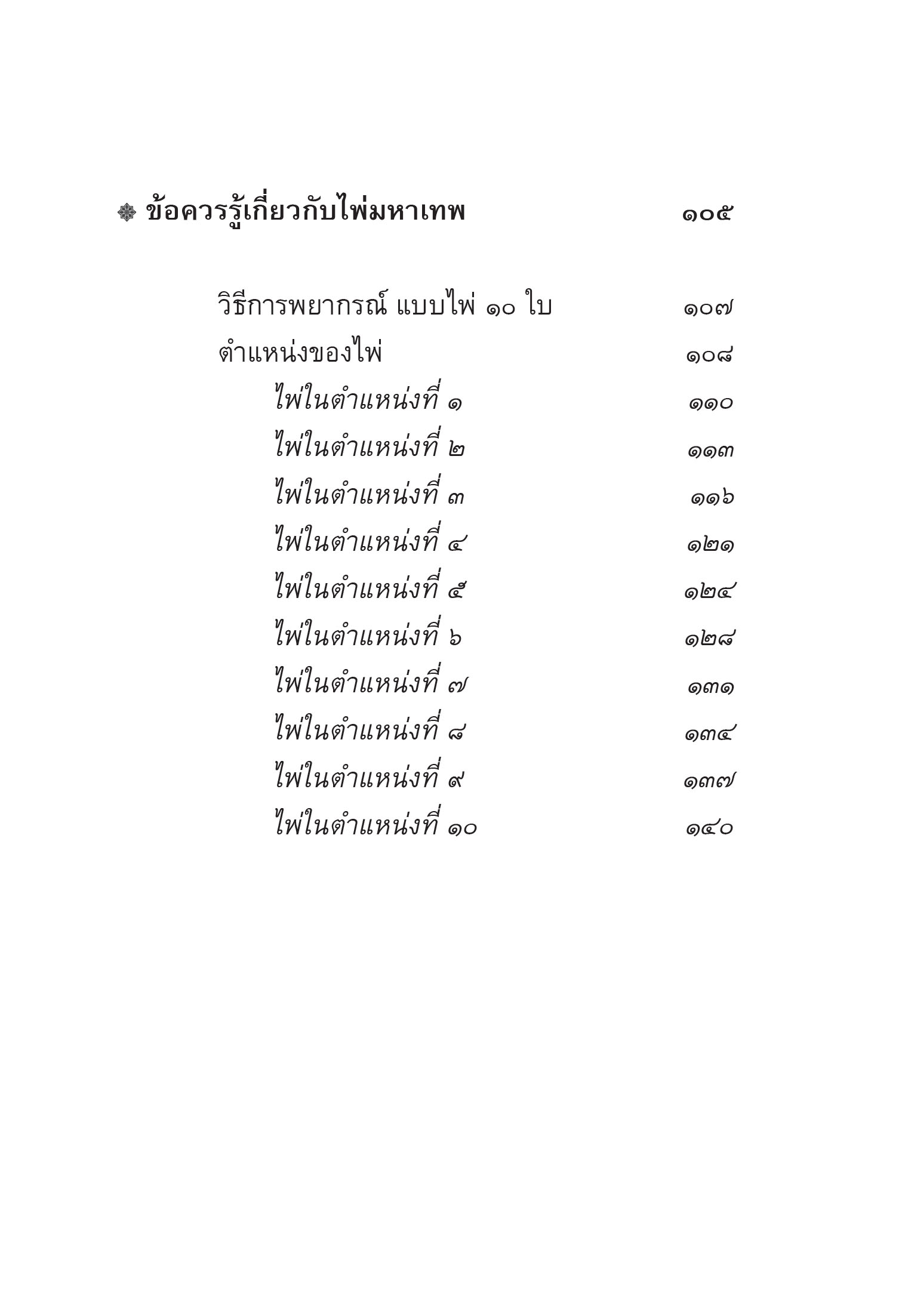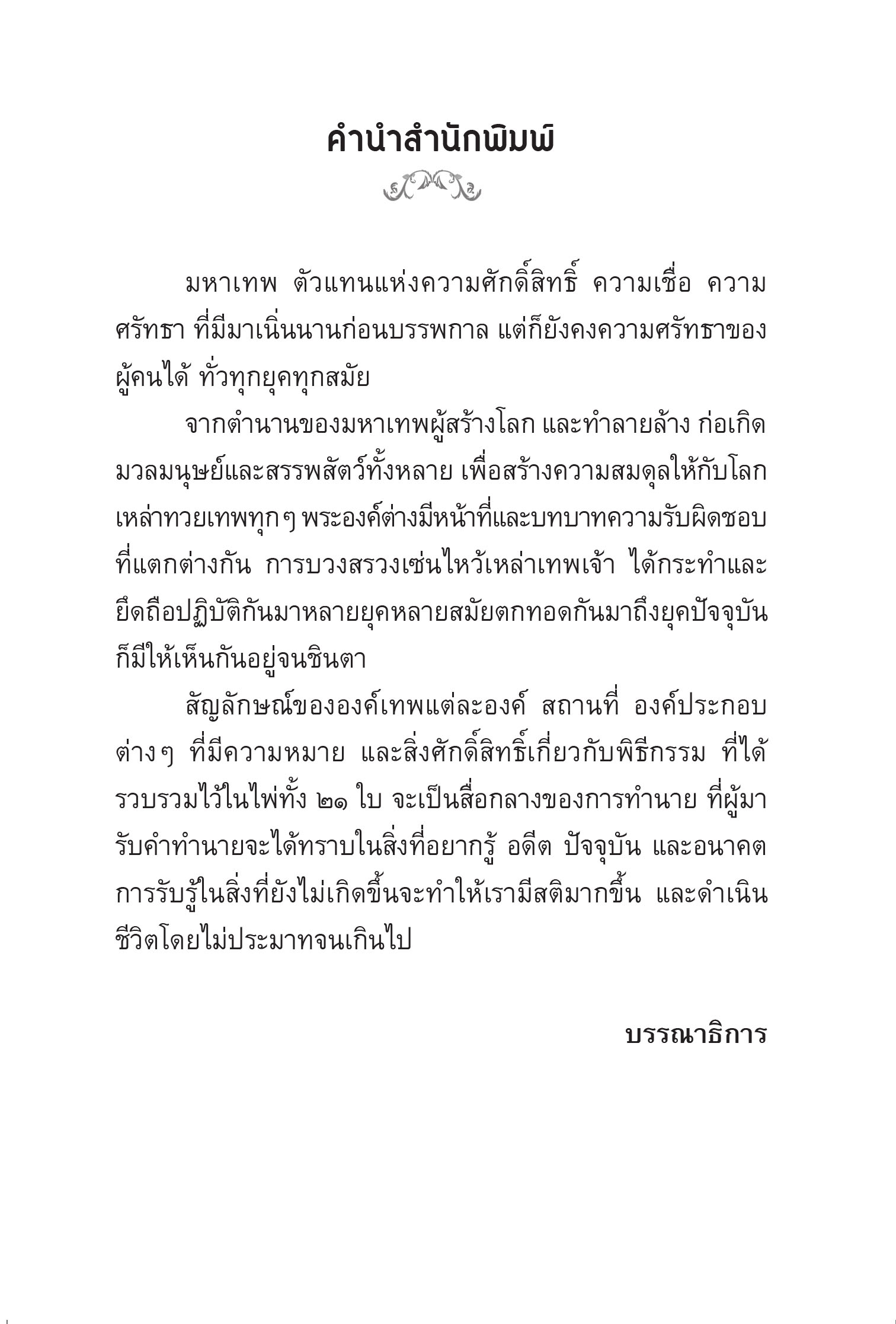 องค์มหาเทพ เป็นตัวแทนแห่งความศักดิ์สิทธิ์ ความเชื่อ และความศรัทธา ที่มีมาเนิ่นนานก่อนบรรพกาล แต่ก็ยังคงความศรัทธาของผู้คนได้ทั่วทุกยุคทุกสมัย จากตำนานของมหาเทพผู้สร้างโลก และทำลายล้าง ก่อเกิดมวลมนุษย์และสรรพสัตว์ทั้งหลาย เพื่อสร้างความสมดุลให้กับโลก เหล่าทวยเทพทุกๆ พระองค์ ต่างมีหน้าที่และบทบาทความรับผิดชอบที่แตกต่างกัน การบวงสรวงเซ่นไหว้เหล่าเทพเจ้า ได้กระทำและยึดถือปฏิบัติกันมาหลายยุคหลายสมัยตกทอดกันมาจนถึงยุคปัจจุบัน ชื่อเทพเจ้า สัญลักษณ์ สถานที่ และองค์ประกอบ ต่างๆ ที่มีความหมาย ความเชื่อเกี่ยวกับพิธีกรรม ได้รวมไว้ในไพ่ทั้ง ๒๑ ใบ ที่จะเป็นสื่อกลางของการทำนาย ที่ผู้มารับคำทำนายจะได้ทราบในสิ่งที่อยากรู้ อดีต ปัจจุบัน และอนาคต "ด้วยปาฎิหาริย์แห่งความศักดิ์สิทธิ์" จากไพ่สำรับนี้ ![]() ![]() ![]() ![]() ![]() ![]() ![]() ![]() ![]() ![]() ![]() ![]() ![]() ![]() |
