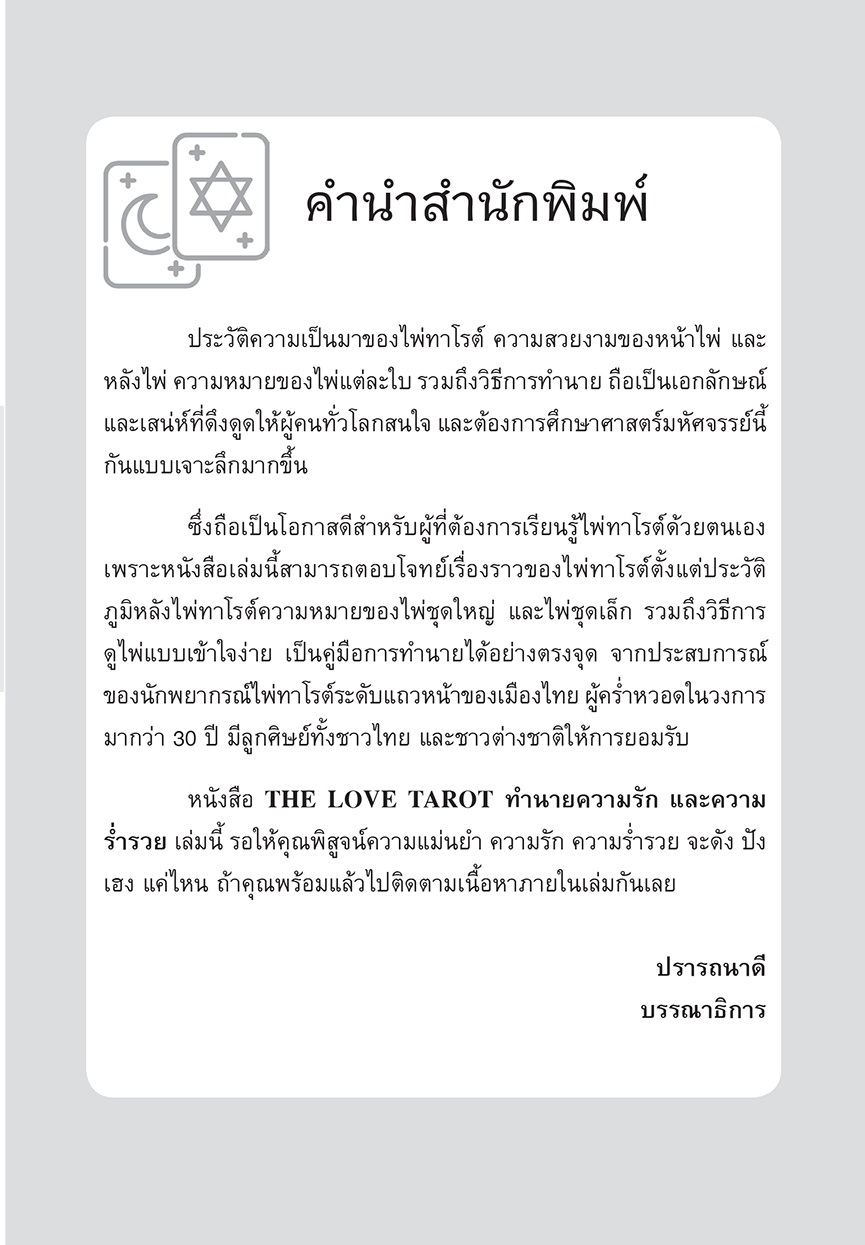 THE LOVE TAROT ทำนายความรัก และความร่ำรวย นำเสนอวิธีการเปิดไพ่ทำนายดวงความรัก รักนี้เป็นอย่างไร จะราบรื่นสมหวังหรือไม่ ค้นหาคำตอบจากไพ่มาโรต์ ตั้งแต่วิธีการวางไพ่ รู้จักความหมายของไพ่แต่ละใบ อีกทั้งยังบอกถึงความหมายอื่น ๆ ร่วมอีกด้วย เช่น เรื่องรายได้ ความร่ำรวย คำแนะนำที่ควรระวังในช่วงนี้ ฯลฯ ![]() ![]() ![]() ![]() ![]() ![]() ![]() ![]() ![]() ![]() ![]() ![]() ![]() ![]() |