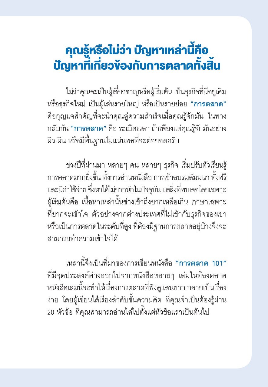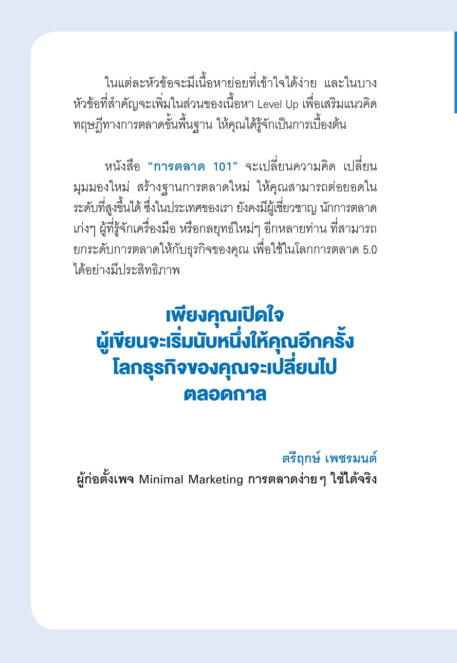 หนังสือการตลาด 101 เล่มนี้ จะเปลี่ยนความคิดและสร้างมุมมองใหม่ๆ ให้กับคุณเพื่อต่อยอดความรู้เรื่องการตลาดที่มีอยู่ เพิ่มความเข้าใจเทคนิคและกลยุทธ์ใหม่ๆ อีกหลายอย่างที่คุณอาจจะยังไม่เคยรู้ เพื่อช่วยยกระดับการตลาดให้กับธุรกิจของคุณในโลกอนาคตของการตลาด 5.0 ได้อย่างมีประสิทธิภาพต่อไป