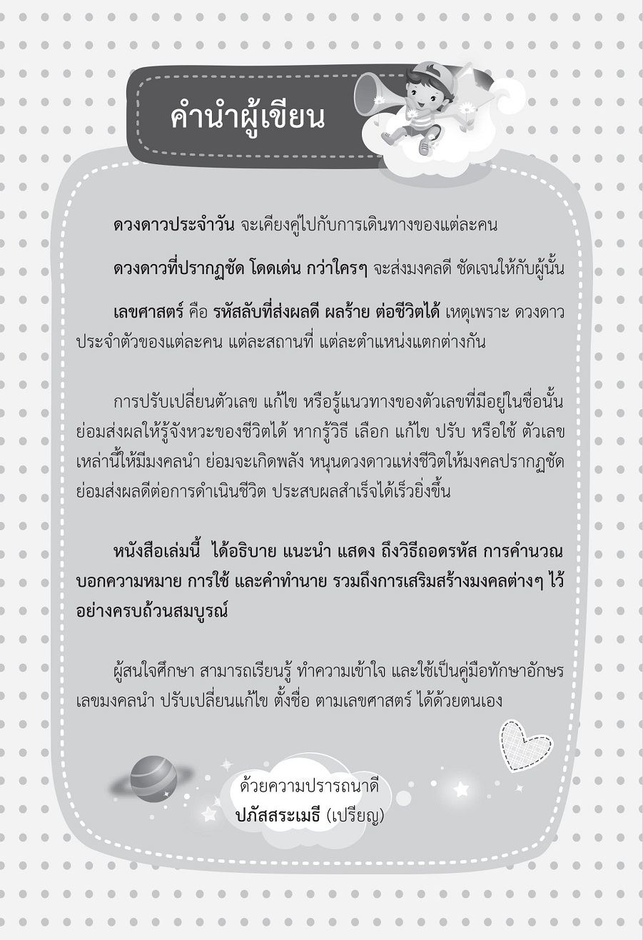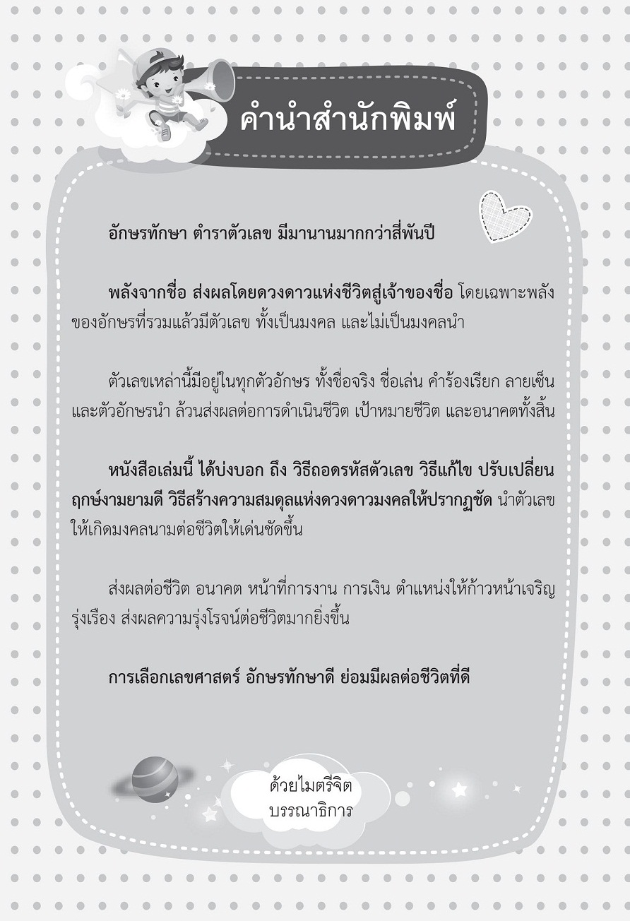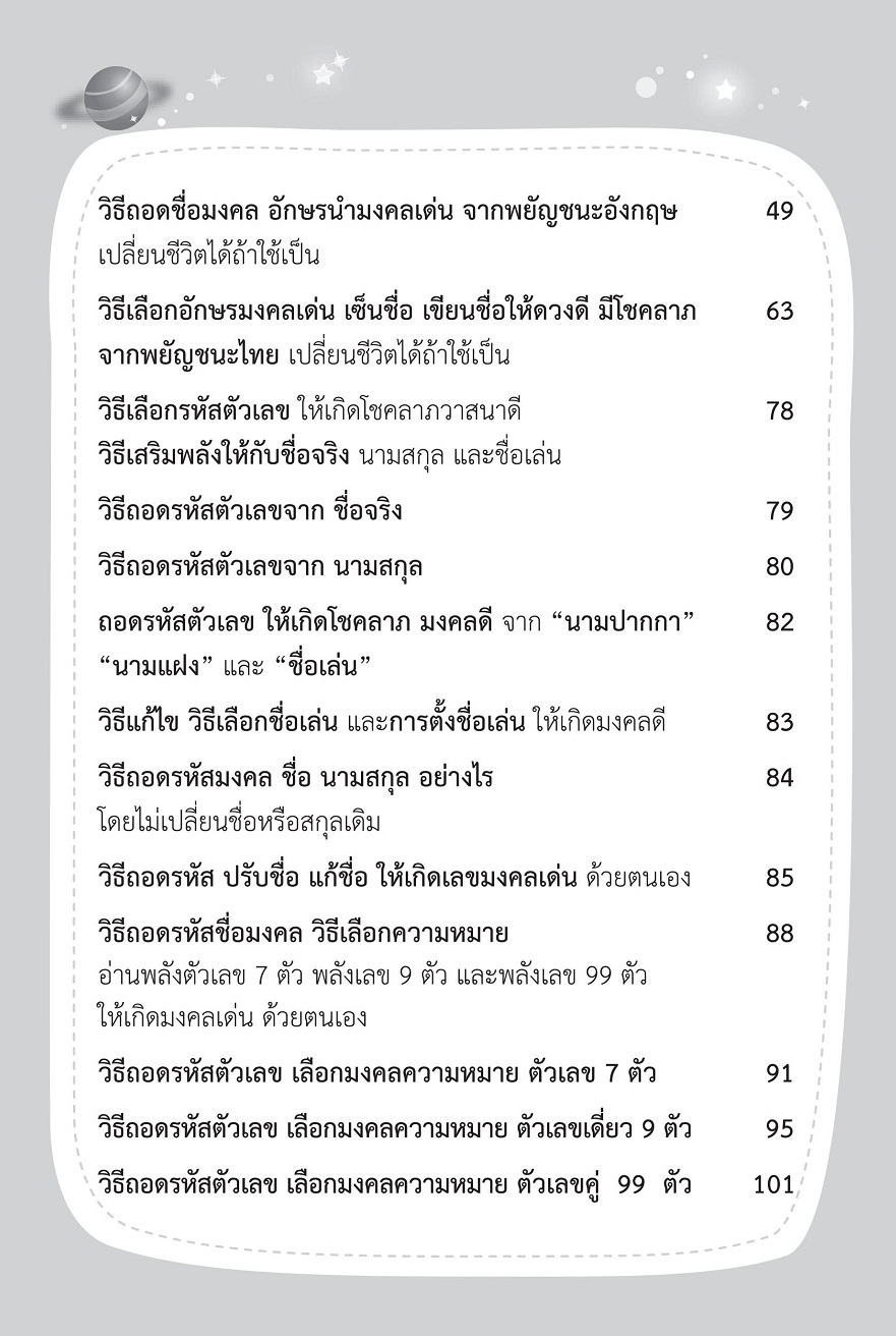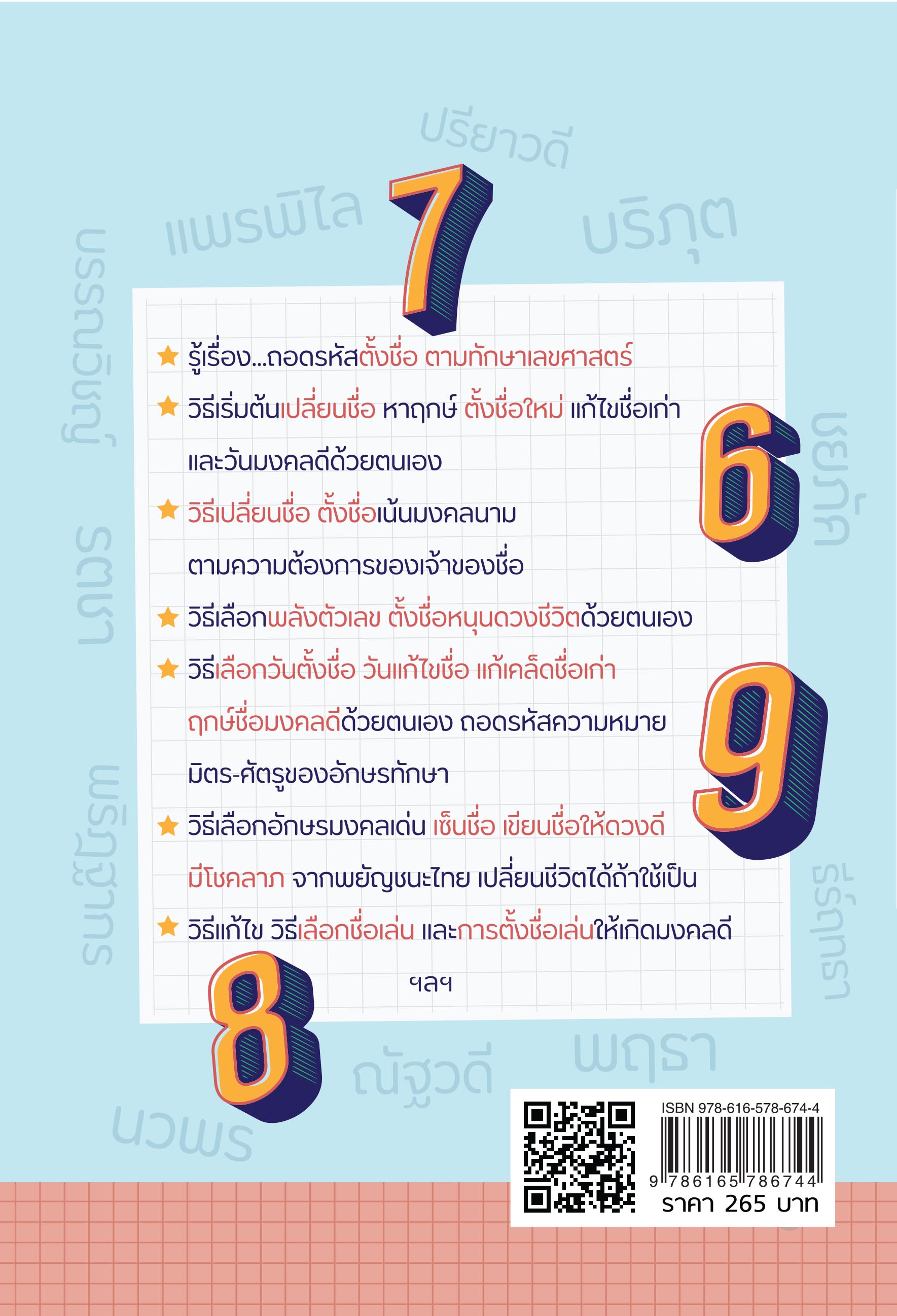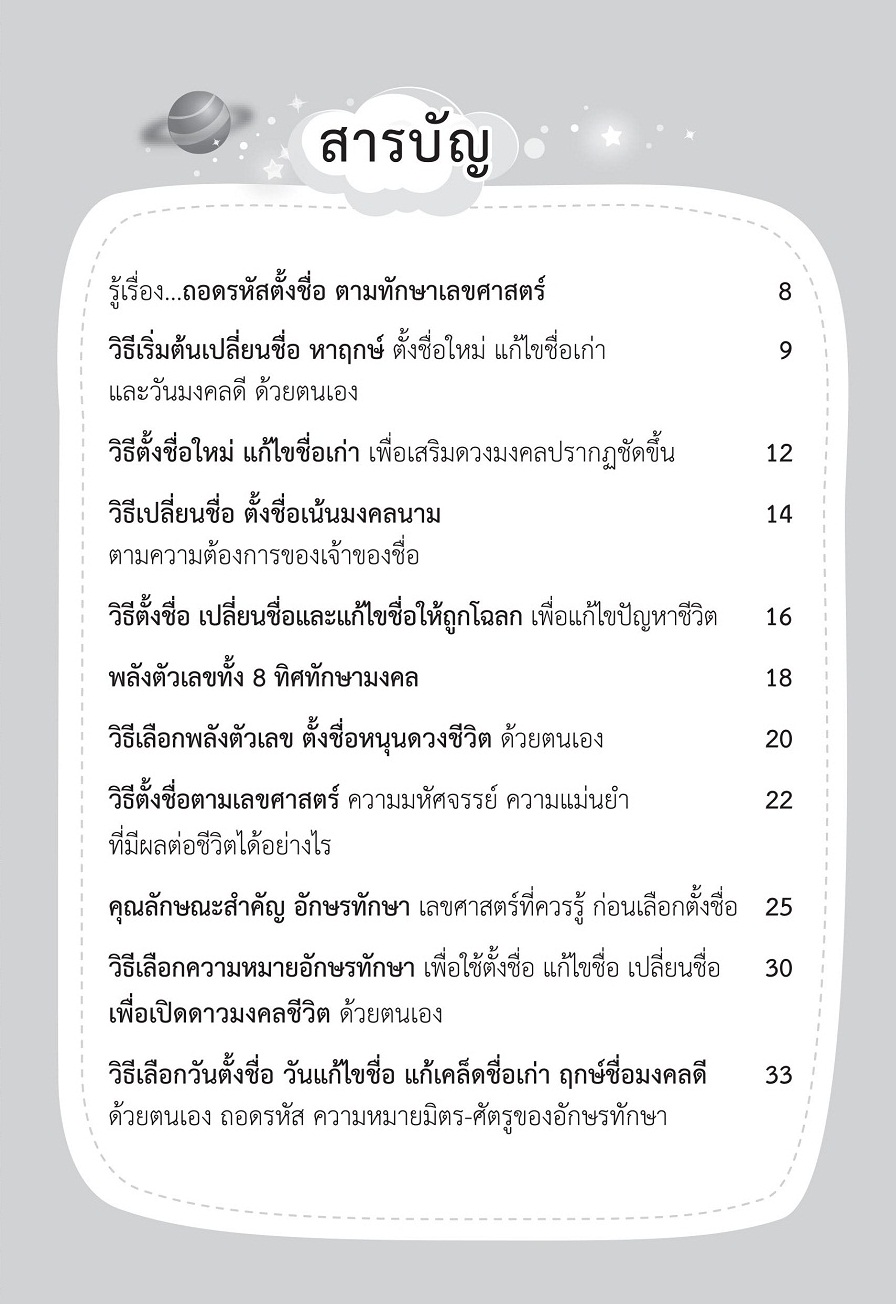 เรียนรู้การตั้งชื่อให้เป็นมงคลนามตามหลักเลขศาสตร์ เพื่อสร้างความสมดุลแห่งดวงดาว รับพลังของอักษรทักษาที่ดีส่งผลต่อชีวิต รู้เรื่อง...ถอดรหัสตั้งชื่อ ตามทักษาเลขศาสตร์ วิธีเริ่มต้นเปลี่ยนชื่อ หาฤกษ์ ตั้งชื่อใหม่ แก้ไขชื่อเก่า และวันมงคลด้วยตนเอง วิธีเปลี่ยนชื่อ ตั้งชื่อเน้นมงคลนาม ฯลฯ