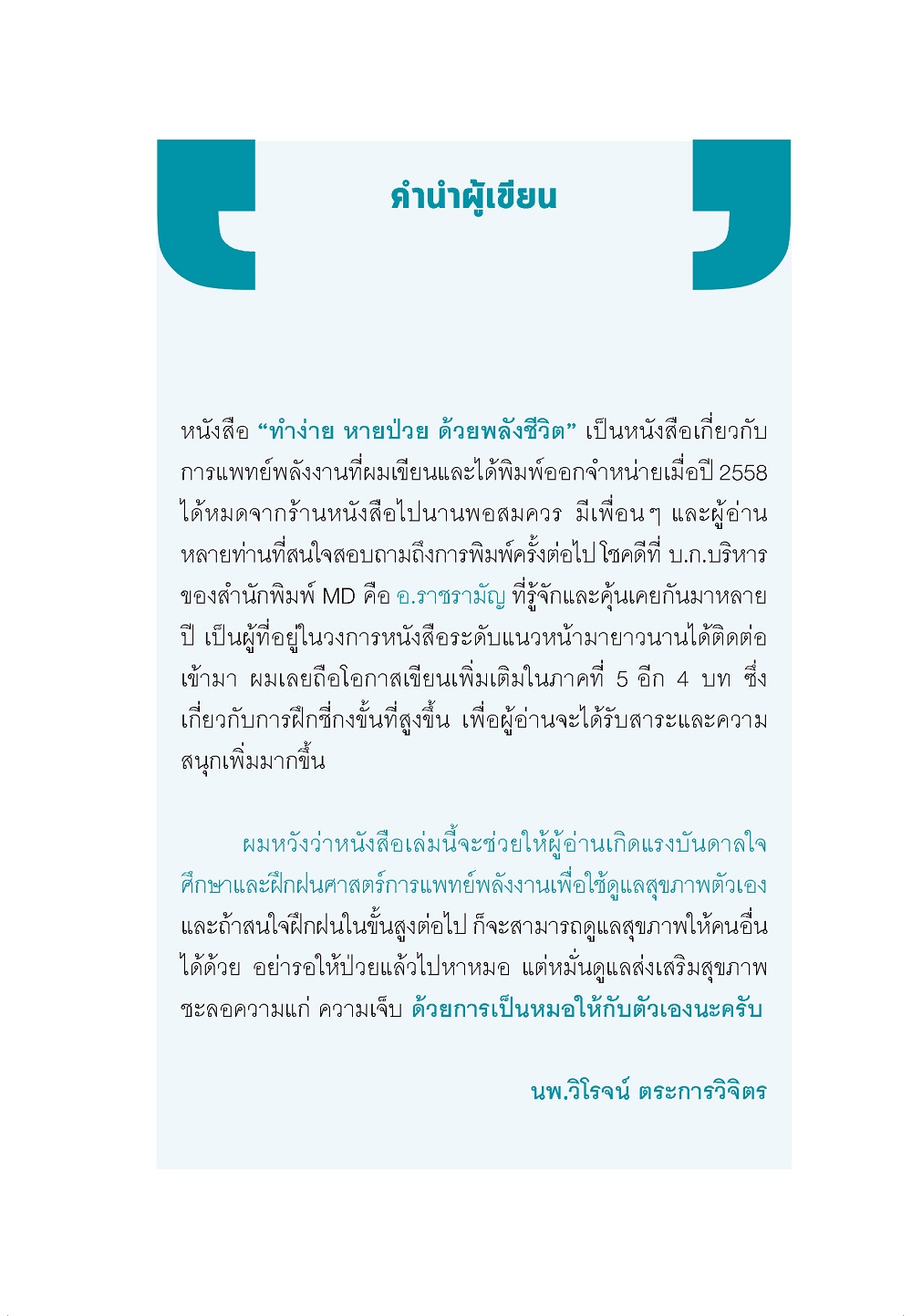 ศึกษาและฝึกฝนศาสตร์การแพทย์พลังงานเพื่อใช้ดูแลสุขภาพตัวเอง และถ้าสนใจฝึกฝนในขั้นสูงต่อไป ก็จะสามารถดูแลสุขภาพให้คนอื่นได้ด้วย อย่ารอให้ป่วยแล้วไปหาหมอ แต่หมั่นดูแลส่งเสริมสุขภาพชะลอความแก่ ความเจ็บ ด้วยการเป็นหมอให้กับตัวเอง ![]() ![]() ![]() ![]() ![]() ![]() ![]() ![]() ![]() ![]() ![]() ![]() |