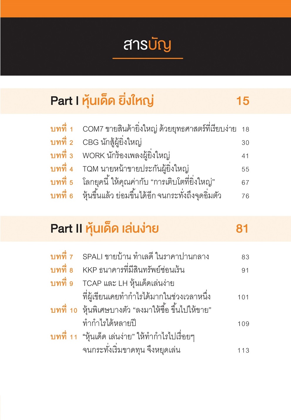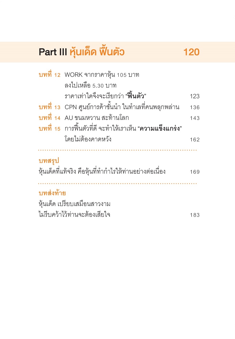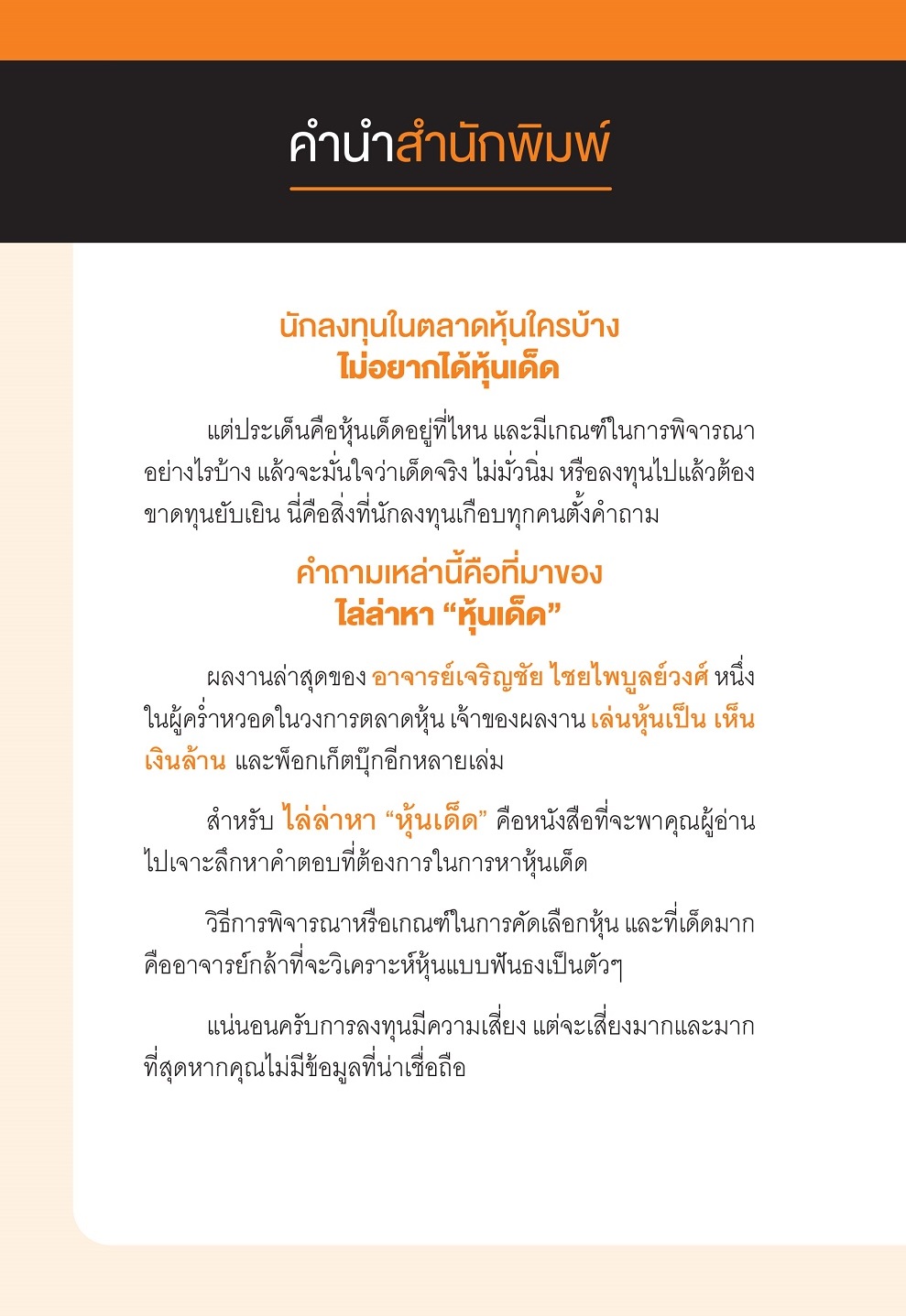 นักลงทุนในตลาดหุ้นใครบ้างไม่อยากได้หุ้นเด็ดแต่ประเด็นคือหุ้นเด็ดอยู่ที่ไหน และมีเกณฑ์ในการพิจารณาอย่างไรบ้าง แล้วจะมั่นใจว่าเด็ดจริง ไม่มั่วนิ่ม หรือลงทุนไปแล้วต้องขาดทุนยับเยิน นี่คือสิ่งที่นักลงทุนเกือบทุกคนตั้งคำถาม สำหรับ “ไล่ล่า หาหุ้นเด็ด” คือ หนังสือที่จะพาคุณผู้อ่านไปเจาะลึก หาคำตอบที่ต้องการในการหาหุ้นเด็ดวิธีการพิจารณาหรือเกณฑ์ในการคัดเลือกหุ้น และที่เด็ดมากคืออาจารย์กล้าที่จะวิเคราะห์หุ้นแบบฟันธงเป็นตัวๆ