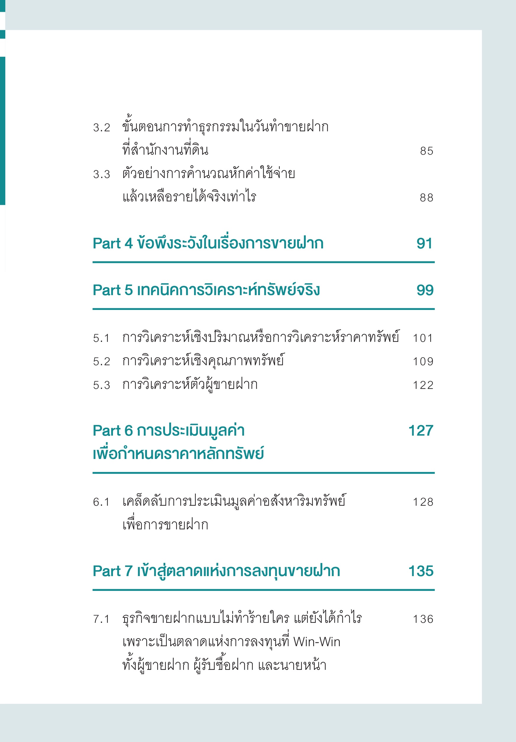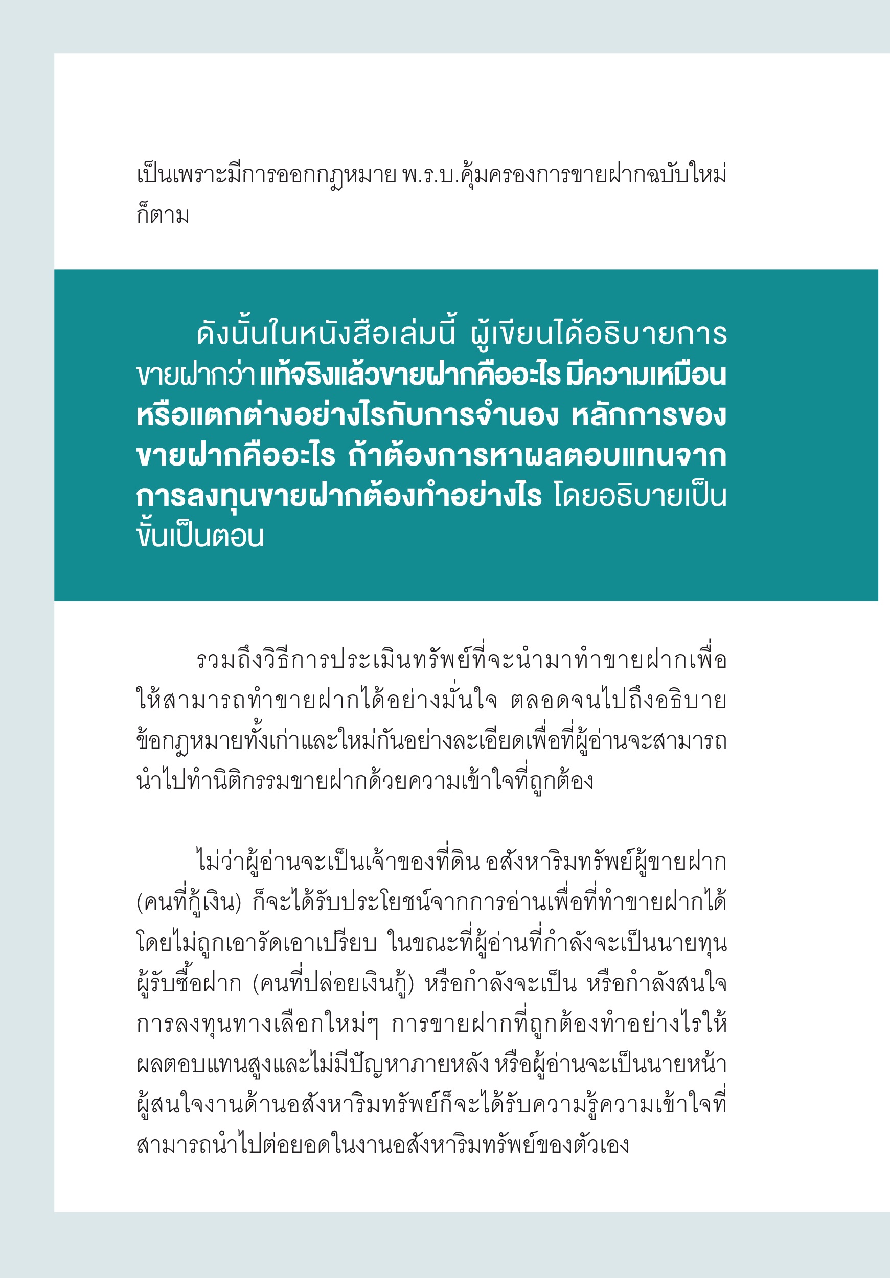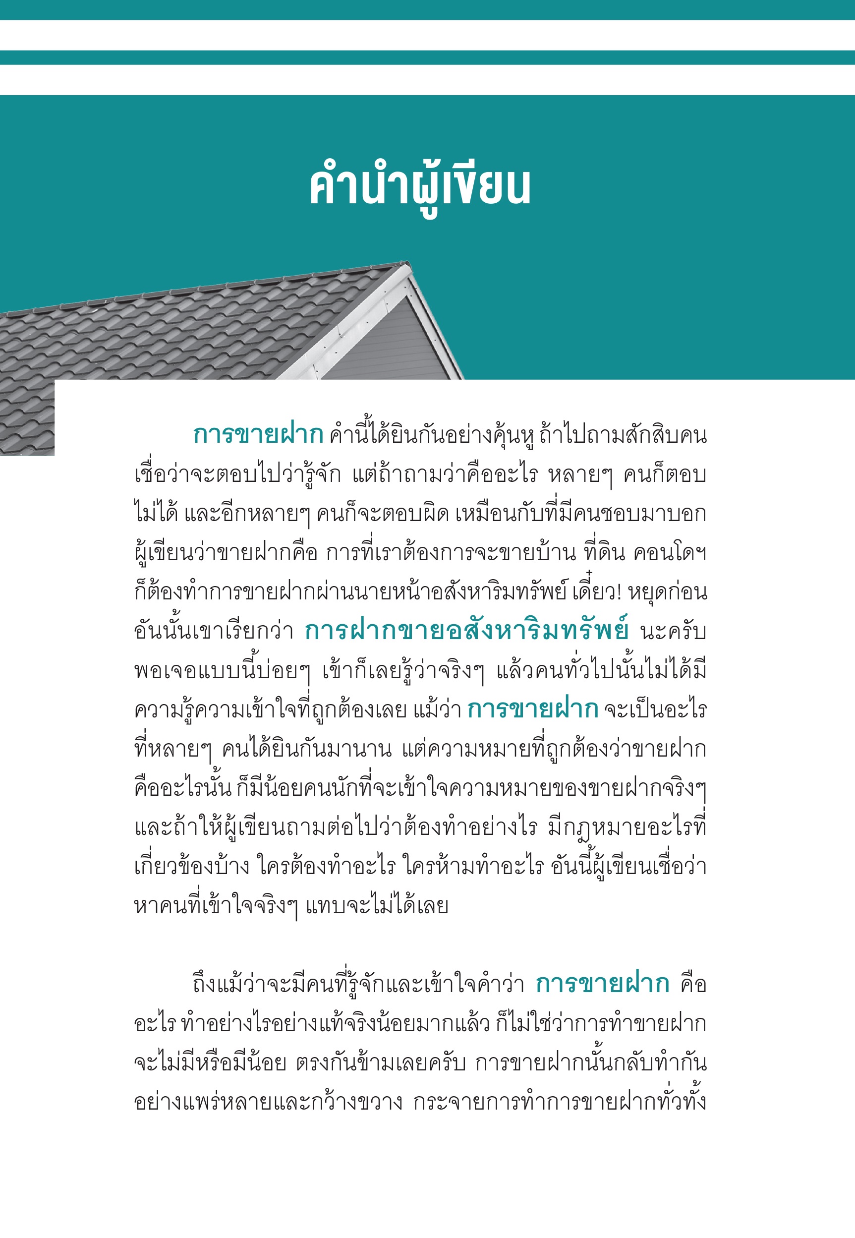 ทั้งเรื่อง การขายฝากคืออะไร ในเล่มนี้มีคำตอบ เรื่องกฎหมาย ที่คนที่จะทำเกี่ยวกับเรื่องขายฝากควรรู้ ขั้นตอน และวิธีการต่างๆ ไว้มากมาย และอื่นๆ อีกที่ได้ผู้เขียนรวบรวมไว้ในเล่มนี้ ถ้าคุณไม่อยากพลาด ไม่อยากขาดทุนต้องศึกษาข้อมูลให้ครบรอบด้าน