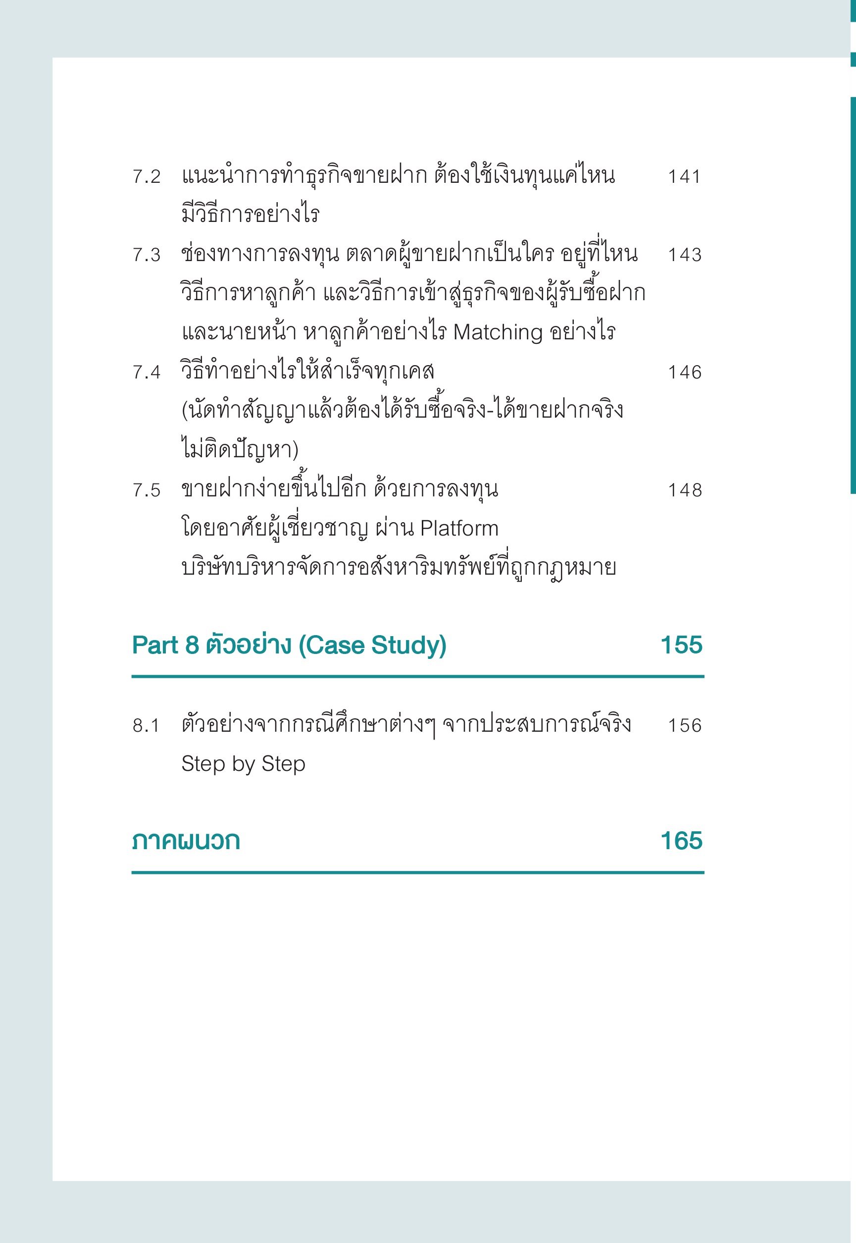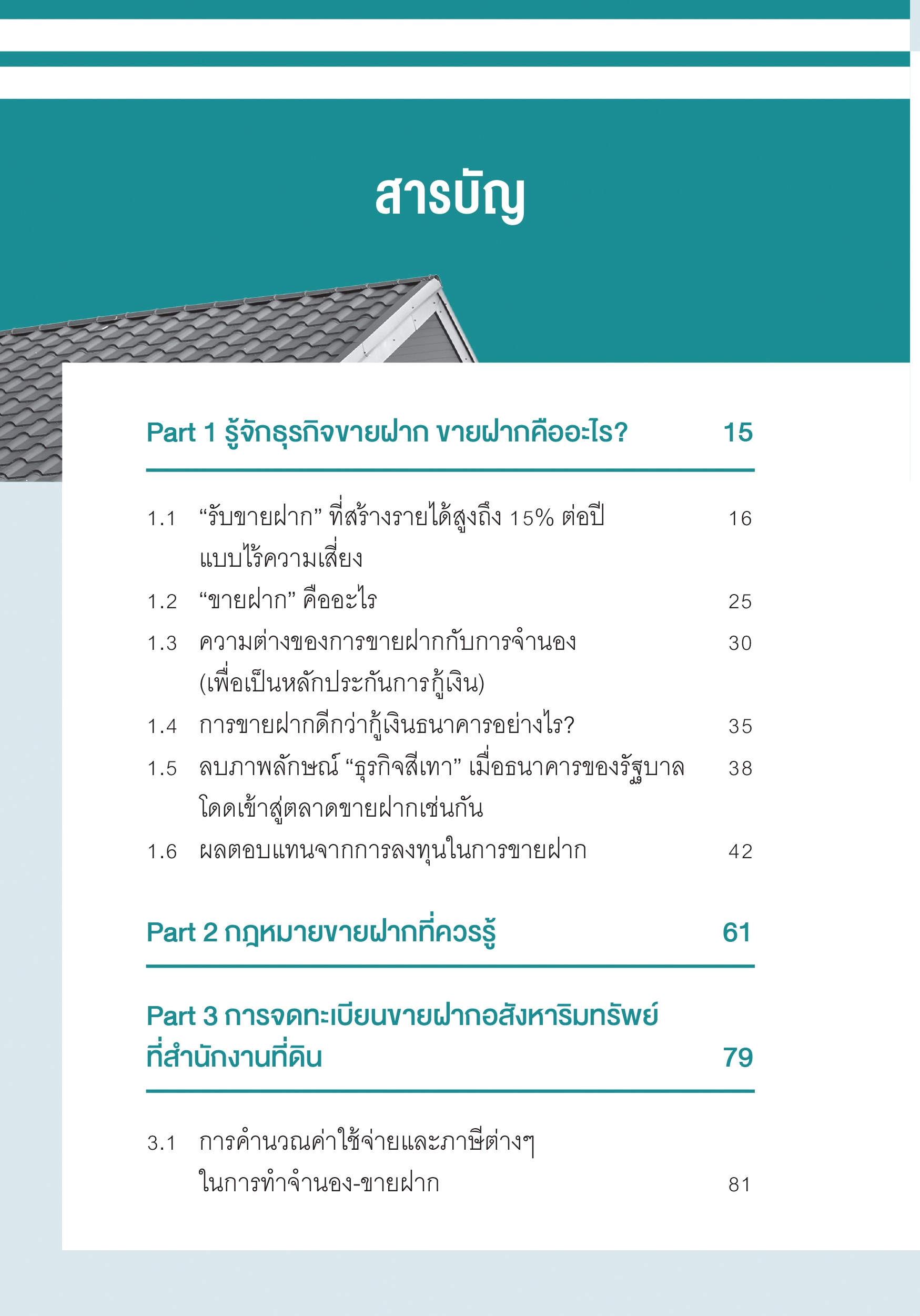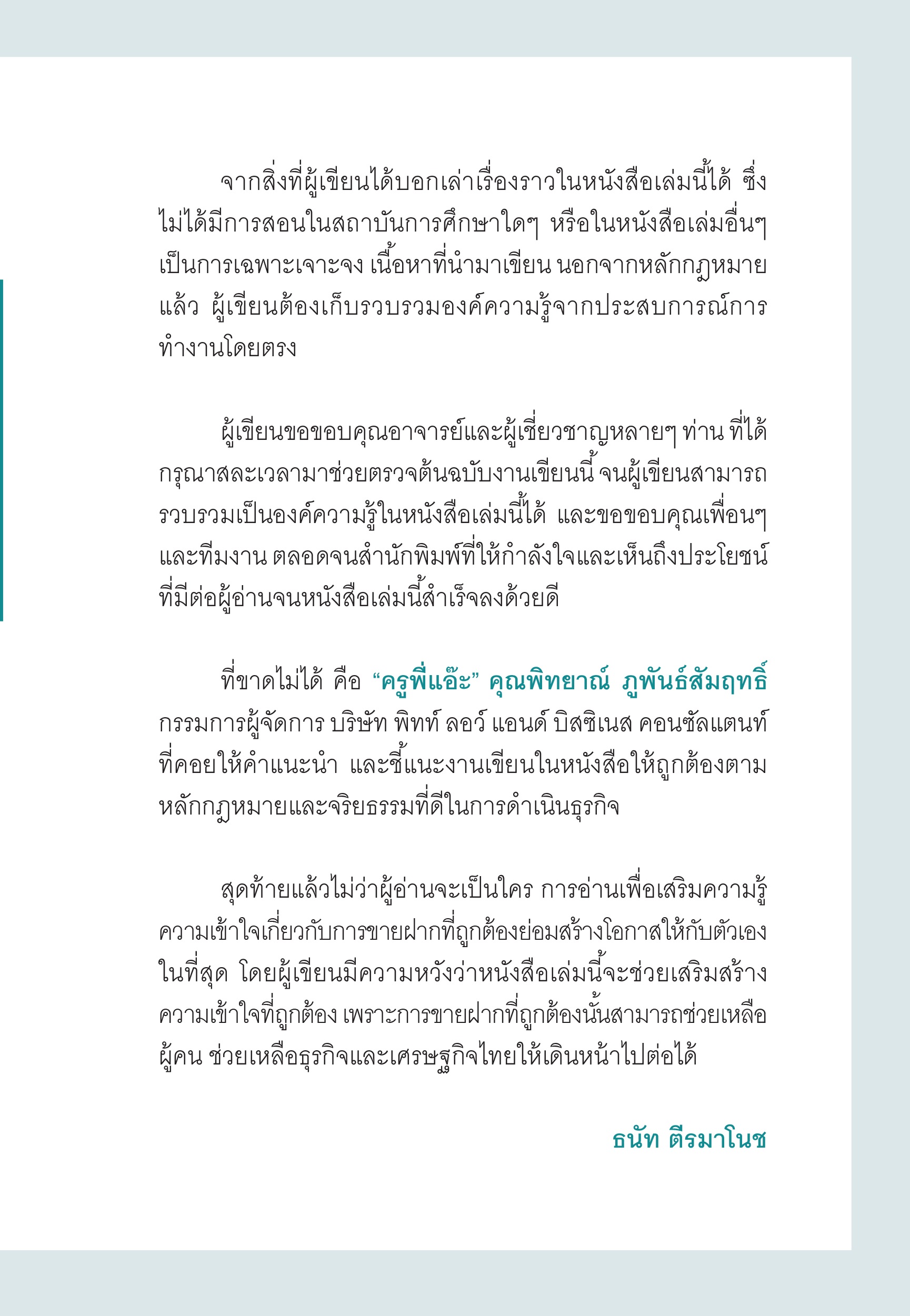 ทั้งเรื่อง การขายฝากคืออะไร ในเล่มนี้มีคำตอบ เรื่องกฎหมาย ที่คนที่จะทำเกี่ยวกับเรื่องขายฝากควรรู้ ขั้นตอน และวิธีการต่างๆ ไว้มากมาย และอื่นๆ อีกที่ได้ผู้เขียนรวบรวมไว้ในเล่มนี้ ถ้าคุณไม่อยากพลาด ไม่อยากขาดทุนต้องศึกษาข้อมูลให้ครบรอบด้าน
