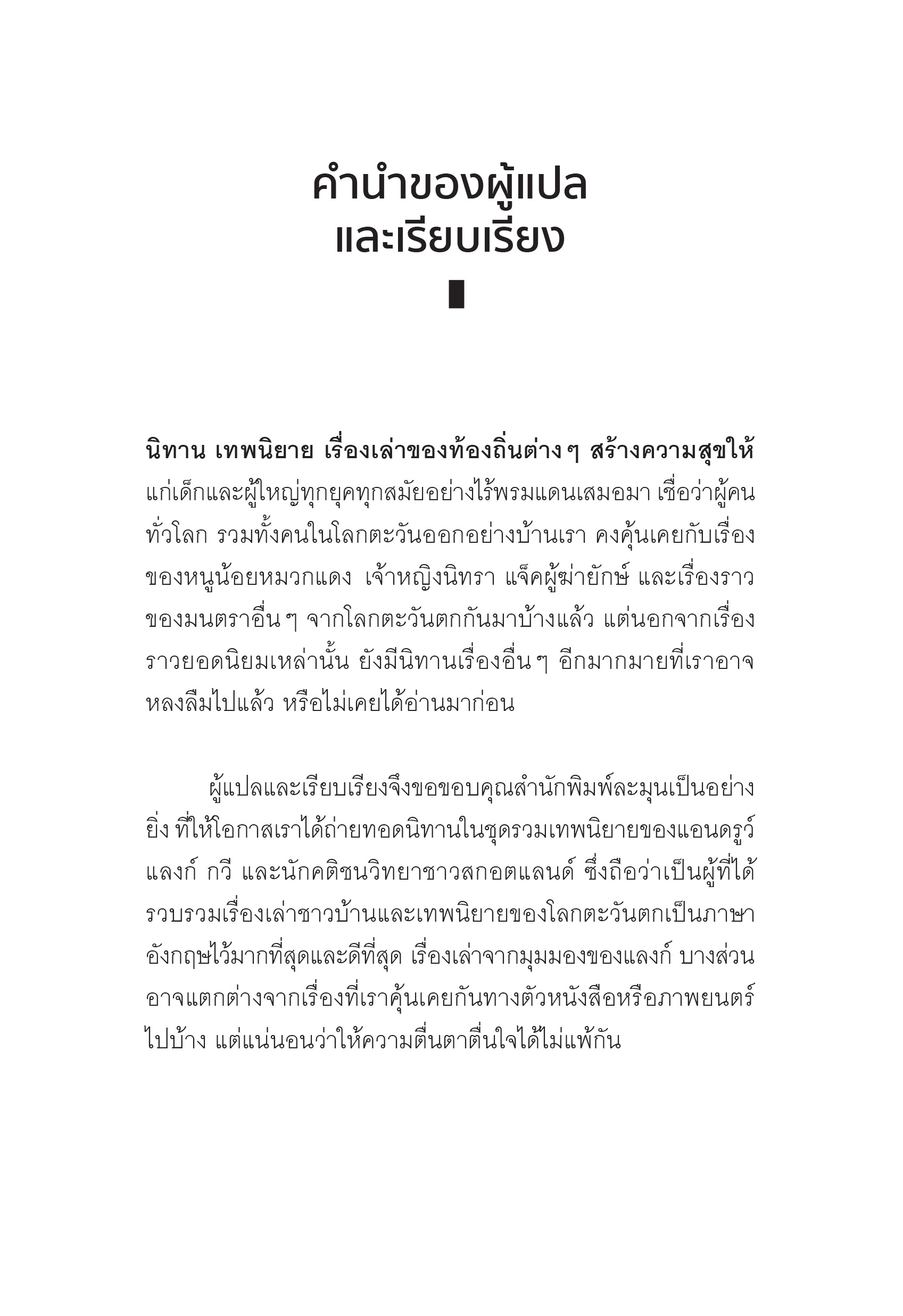 นิทาน เทพนิยาย เรื่องเล่าของท้องถิ่นต่างๆ สร้างความสุขให้แก่เด็กและผู้ใหญ่ทุกยุคทุกสมัยเสมอมา เชื่อว่าผู้คนทั่วโลก รวมทั้งคนในโลกตะวันออกอย่างบ้านเรา คงคุ้นเคยกับเรื่องของหนูน้อยหมวกแดง เจ้าหญิงนิทรา แจ็คผู้ฆ่ายักษ์ และเรื่องราวของมนตราอื่นๆ จากโลกตะวันตกกันมาบ้างแล้ว แต่นอกจากเรื่องราวยอดนิยมเหล่านั้น ยังมีนิทานเรื่องอื่นๆ อีกมากมายที่เราอาจ