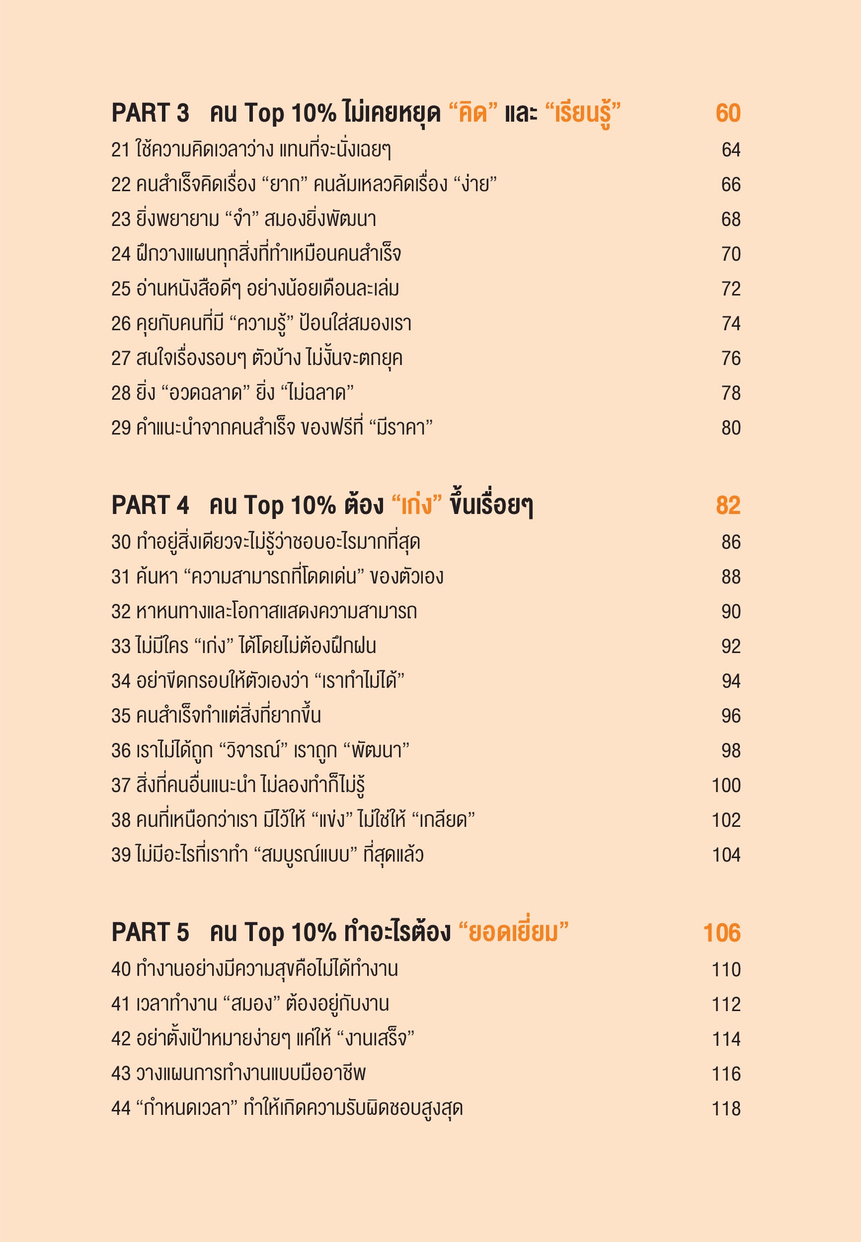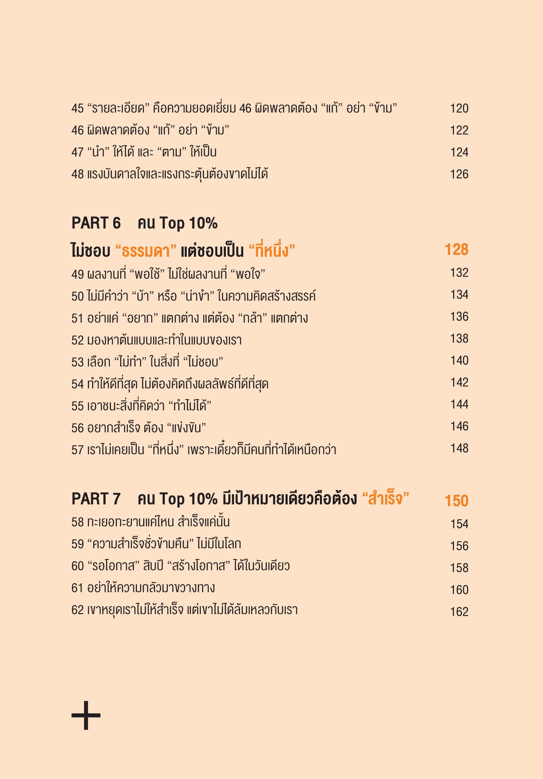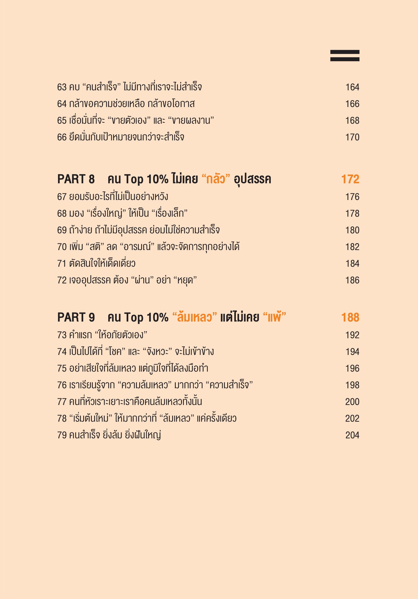 ถ้าคุณหยิบหนังสือเล่มนี้ขึ้นมา คุณมีแล้วแน่นอนคือ “ความทะเยอทะยาน” ที่จะพาตัวเองขึ้นไปยังจุดที่สูงกว่า แต่อาจจะแค่ไม่เคยตั้งเป้าหมายอย่างจริงจัง และหนังสือเล่มนี้ก็ไม่ได้แค่จะช่วยให้คุณ “ตั้งเป้าหมายที่จะเป็นคน Top 10% ในสิ่งที่คุณทำ” แต่ยังจะบอกเคล็ดลับให้คุณรู้ว่า คนที่ยืนอยู่ในจุดที่เหนือกว่าคุณ (แม้เขาจะไม่ได้เหนือกว่าคุณ) เขา “คิด” และ “ทำ” อย่างไร ถึงสำเร็จไปถึงขนาดนั้นได้ เคล็ดลับที่บอกในหนังสือเล่มนี้อาจดูเหมือนง่าย แต่เชื่อไหมว่าคน 90% ก็ไม่ได้ทำ คุณอาจคิดว่าสิ่งเล็กๆ น้อยๆ เหล่านี้น่ะเหรอที่ทำให้คนธรรมดาๆ ทำอะไรสำเร็จจนขึ้นไปถึง Top 10% ได้ ใช่! ถูกแล้ว และถ้าคุณยังยืนยันว่าพวกเขาเหล่านี้มีอะไรที่เหนือกว่าคุณ หนังสือเล่มนี้จะทำให้คุณเปลี่ยนความคิด! และเมื่อใดที่คุณเริ่มคิดและทำเหมือนคนที่อยู่ในระดับ Top 10% เมื่อนั้นคุณจะไปยืนข้างๆ พวกเขา ![]() ![]() ![]() ![]() ![]() ![]() ![]() ![]() ![]() ![]() ![]() ![]() ![]() ![]() ![]() ![]() |