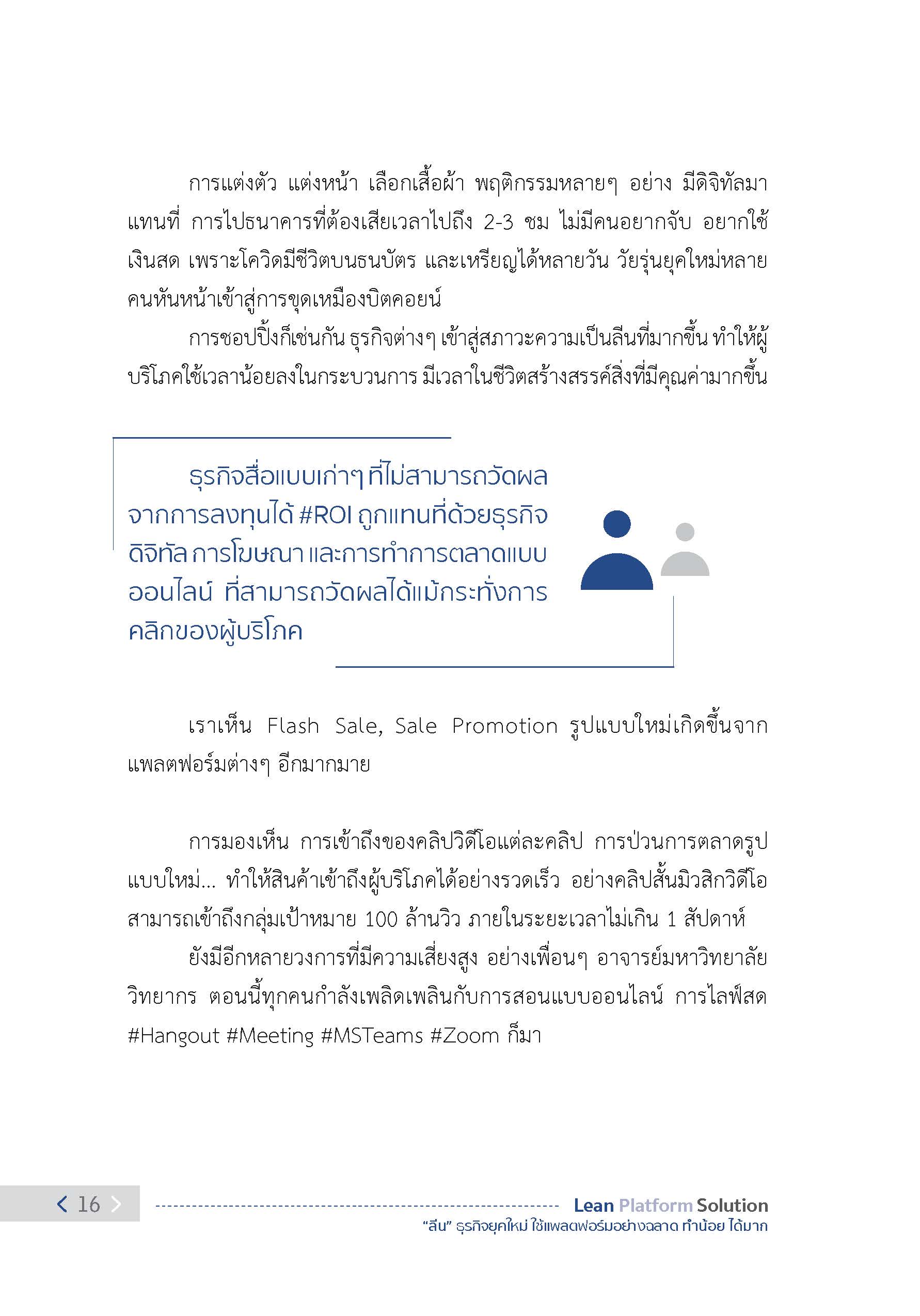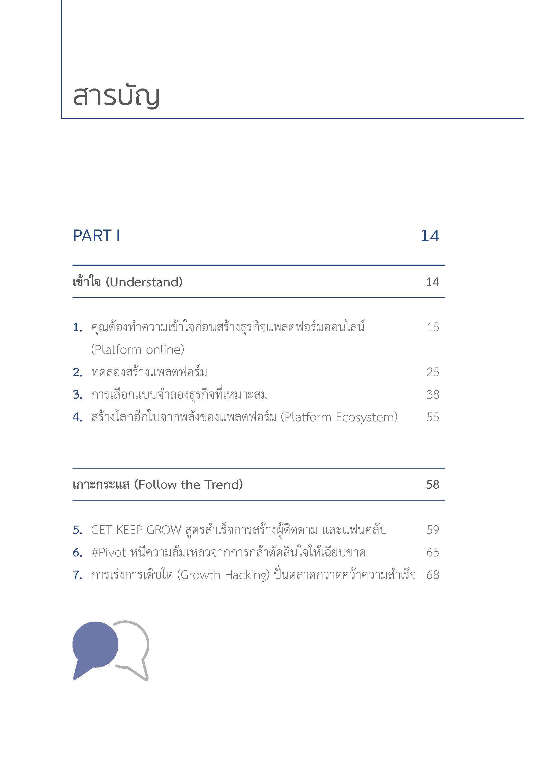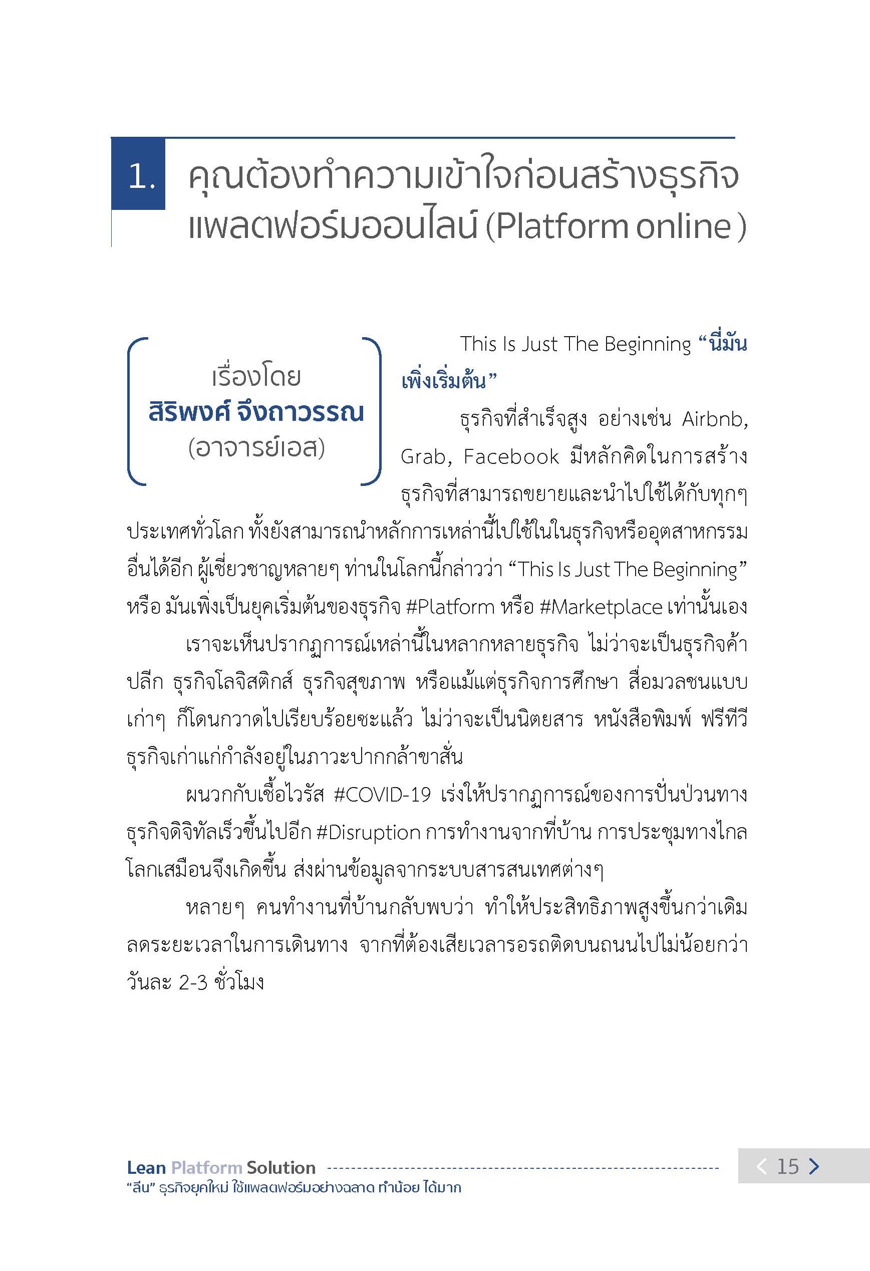 หนังสือเล่มนี้จะช่วยให้คุณทำความรู้จักกับ Platform ออนไลน์ เพื่อใช้ในการสร้างธุรกิจ หรือสนับสนุนธุรกิจให้เติบโต โดยอาศัย Platform ที่สร้างสรรค์และเข้าถึงลูกค้าในวงกว้าง โดยยกตัวอย่าง Platform ที่ประสบความสำเร็จอย่างยิ่งใหญ่ทั่วโลก นำมาชำแหละอย่างละเอียด ให้คุณได้เห็นขั้นตอนและวิธีคิดที่เปลี่ยนโลกของ Platform เหล่านั้นว่าเขาทำได้อย่างไร และมันไม่ยากหากคุณต้องการจะทำ เพียงแค่คุณต้องกล้าที่จะคิด