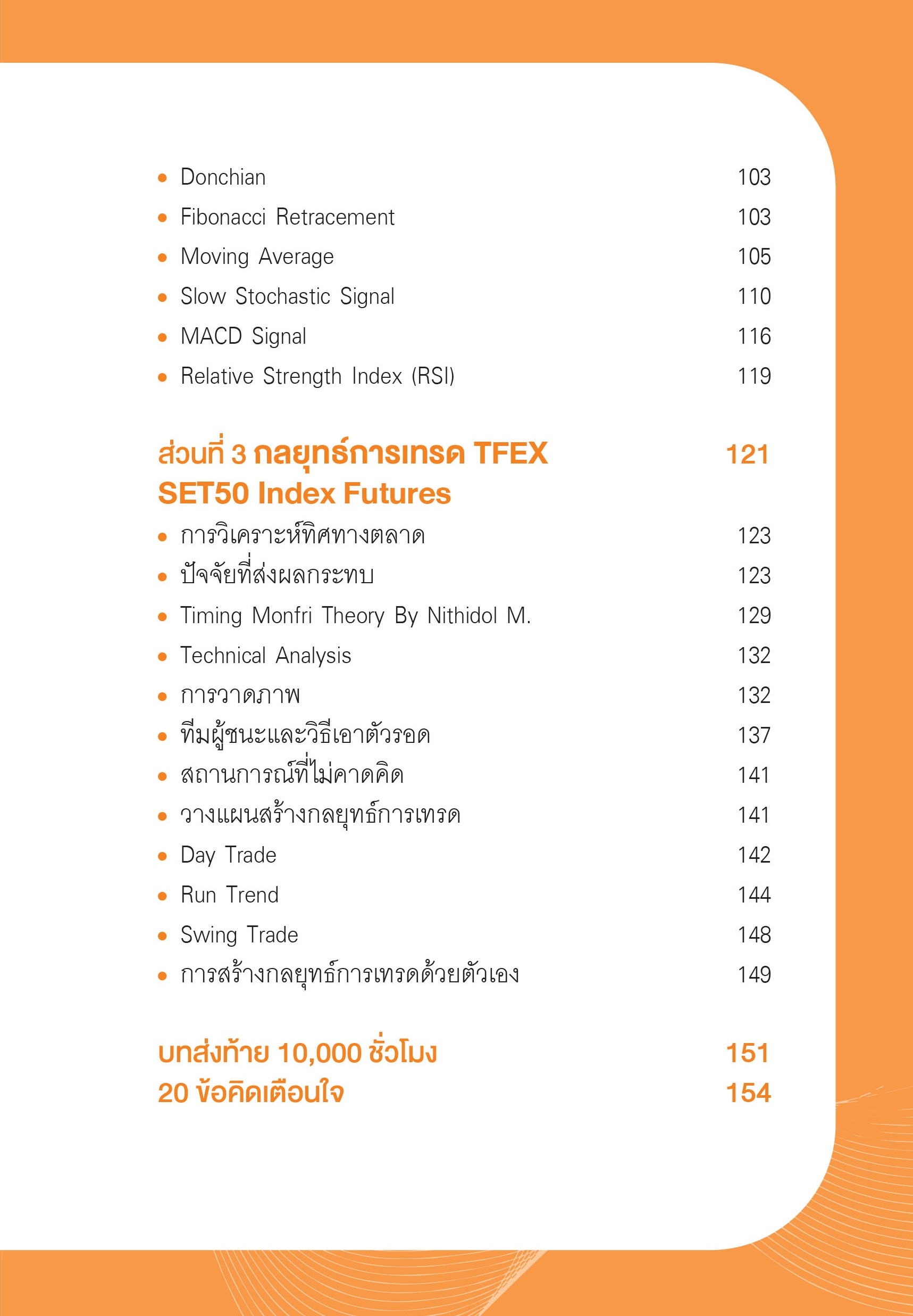 เนื้อหาในหนังสือเล่มนี้ จะกล่าวถึง TFEX SET50 Index Futures ตลาดสัญญาซื้อขายล่วงหน้า เพื่อให้ผู้อ่านได้นำไปประกอบในการตัดสินใจเกี่ยวกับการลงทุน ซึ่งจะกล่าวเจาะจงเกี่ยวกับรายละเอียดต่างๆ ของ TFEX SET50 Index Futures ตั้งแต่เริ่มต้นจนถึงขั้นเทรดเป็น เทรดเก่ง เทรดได้ดีมีกำไร