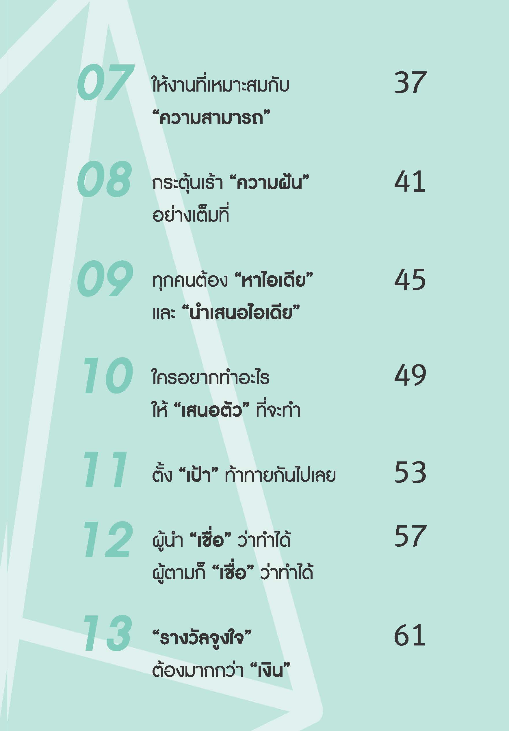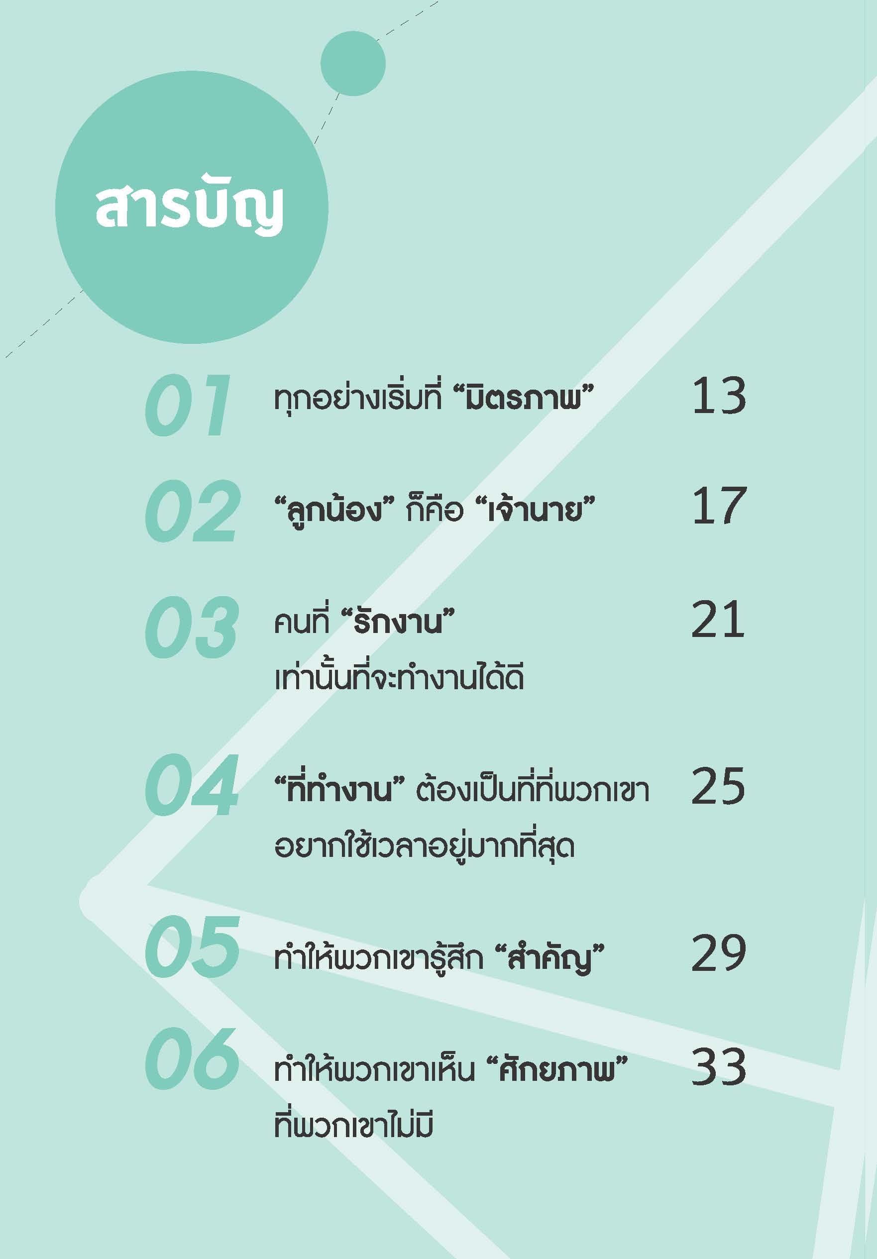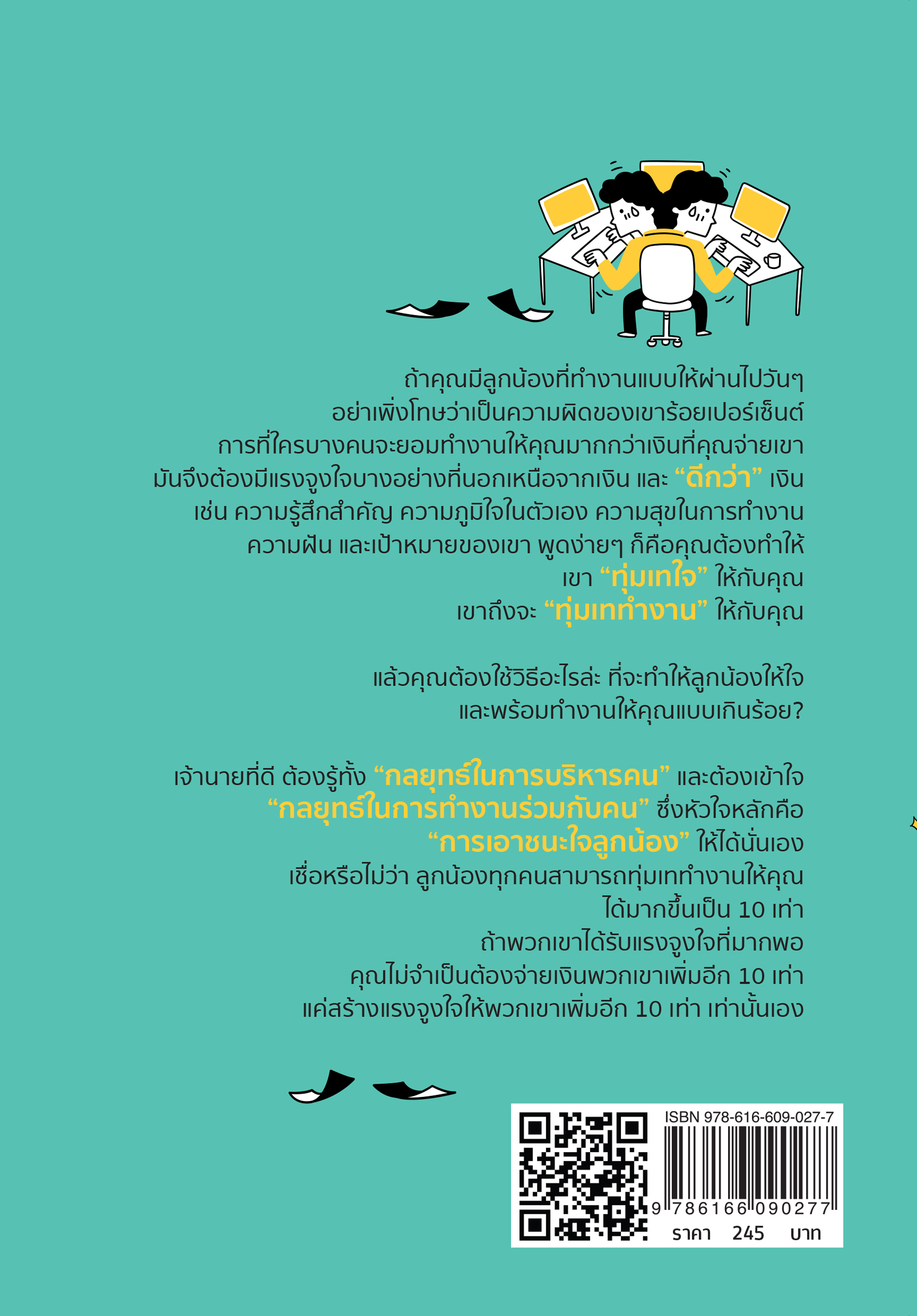 เคล็ดลับเพื่อสร้างแรงจูงใจให้ลูกน้องทุ่มใจทำงานให้เราแบบเกินร้อย การที่ใครบางคนจะยอมทำงานให้คุณมากกว่าเงินที่คุณจ่ายเขา มันจึงต้องมีแรงจูงใจบางอย่างที่นอกเหนือจากเงิน และ “ดีกว่า” เงิน เช่น ความรู้สึกสำคัญ ความภูมิใจในตัวเอง ความสุขในการทำงาน ความฝัน และเป้าหมายของเขา พูดง่ายๆ ก็คือ คุณต้องทำให้เขา “ทุ่มเทใจ” ให้กับคุณ เขาถึงจะ “ทุ่มเททำงาน” ให้กับคุณ แล้วคุณต้องใช้วิธีอะไรล่ะ ที่จะทำให้ลูกน้องให้ใจ และพร้อมทำงานให้คุณแบบเกินร้อยเจ้านายที่ดี ต้องรู้ทั้ง “กลยุทธ์ในการบริหารคน” และต้องเข้าใจ “กลยุทธ์ในการทำงานร่วมกับคน” ซึ่งหัวใจหลักคือ “การเอาชนะใจลูกน้อง” ให้ได้นั่นเอง ![]() ![]() ![]() ![]() ![]() ![]() ![]() ![]() ![]() ![]() ![]() ![]() ![]() ![]() ![]() ![]() |