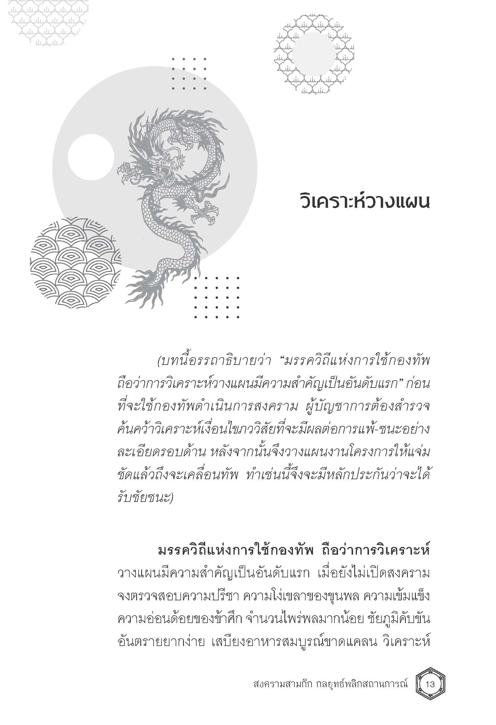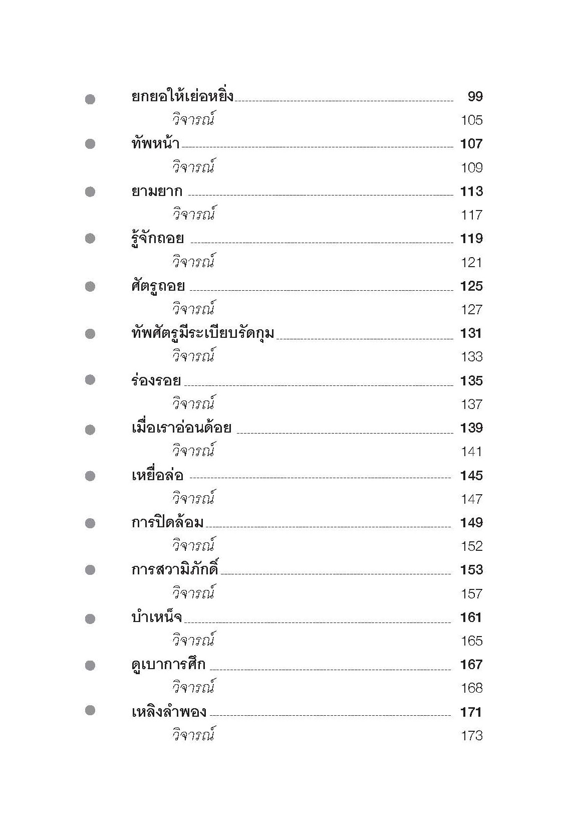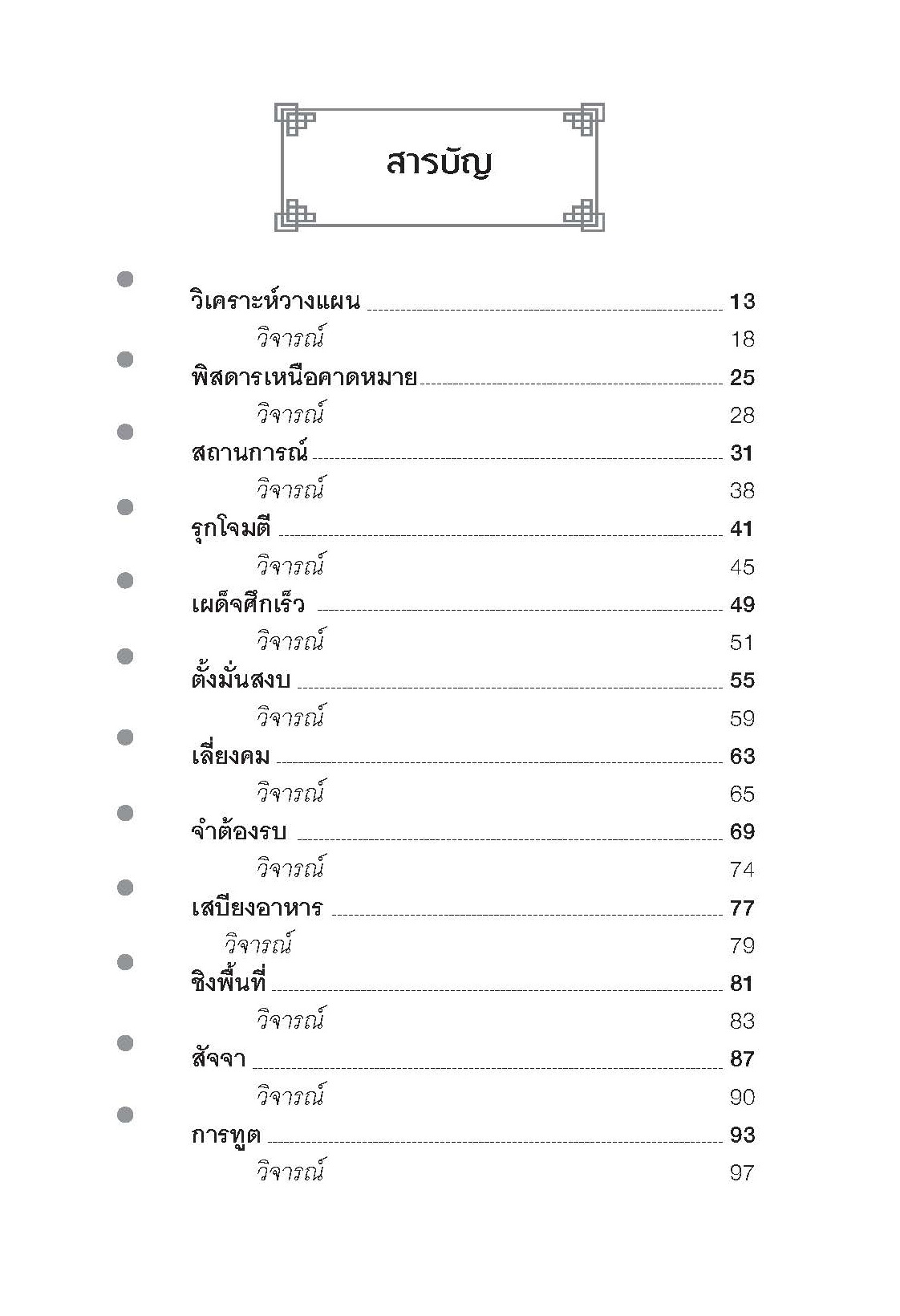 พิชัยสงคราม หนึ่งร้อยกระบวนยุทธ์ เขียนขึ้นในสมัยราชวงศ์ซ้อง (ก่อนสุโขทัยหลายร้อยปี) ปราชญ์ท่านใดรจนาขึ้นไม่มีบันทึกบ่งบอกไว้ เนื้อหากล่าวถึงหลักพิชัยสงครามหนึ่งร้อยข้อ แต่ละหัวข้อมีคำอธิบายตัวทฤษฎีแล้วจึงยกตัวอย่างรูปธรรมจากการสงครามในอดีตมาเป็นอุทาหรณ์ ผู้เขียนได้คัดเลือกแปลเฉพาะหัวข้อที่มีตัวอย่างจากสามก๊กพร้อมทั้งเขียนคำวิพากษ์วิจารณ์ประกบอไว้ด้วย เนื้อหามีหลากหลายครบรสและแฝงด้วยปรัชญา หากผู้ใดนำไปต่อยอดได้นับว่าเป็นยอดคน ![]() ![]() ![]() ![]() ![]() ![]() ![]() ![]() ![]() ![]() ![]() ![]() ![]() ![]() ![]() ![]() |