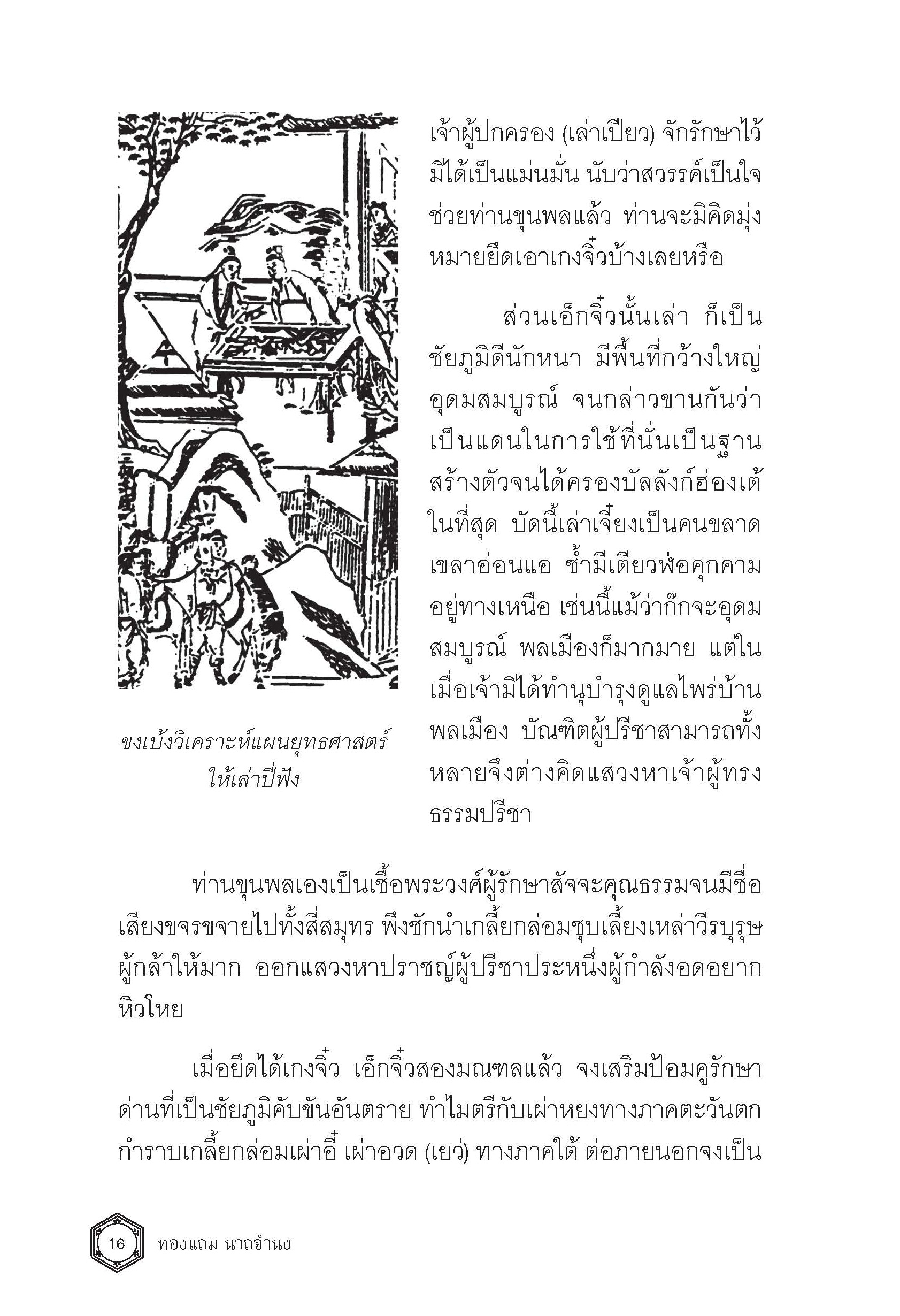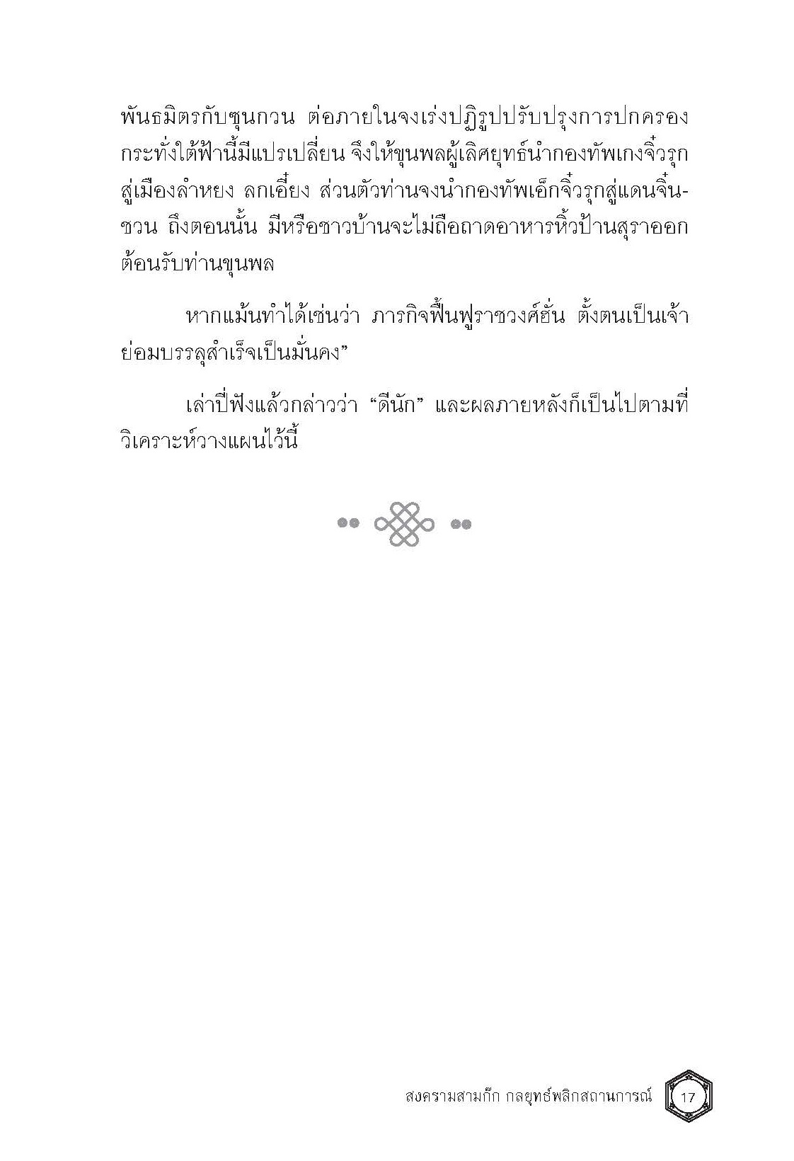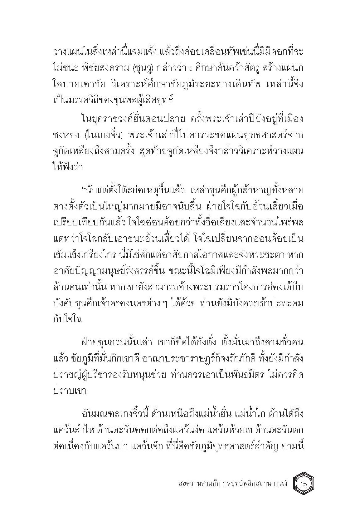 พิชัยสงคราม หนึ่งร้อยกระบวนยุทธ์ เขียนขึ้นในสมัยราชวงศ์ซ้อง (ก่อนสุโขทัยหลายร้อยปี) ปราชญ์ท่านใดรจนาขึ้นไม่มีบันทึกบ่งบอกไว้ เนื้อหากล่าวถึงหลักพิชัยสงครามหนึ่งร้อยข้อ แต่ละหัวข้อมีคำอธิบายตัวทฤษฎีแล้วจึงยกตัวอย่างรูปธรรมจากการสงครามในอดีตมาเป็นอุทาหรณ์ ผู้เขียนได้คัดเลือกแปลเฉพาะหัวข้อที่มีตัวอย่างจากสามก๊กพร้อมทั้งเขียนคำวิพากษ์วิจารณ์ประกบอไว้ด้วย เนื้อหามีหลากหลายครบรสและแฝงด้วยปรัชญา หากผู้ใดนำไปต่อยอดได้นับว่าเป็นยอดคน ![]() ![]() ![]() ![]() ![]() ![]() ![]() ![]() ![]() ![]() ![]() ![]() ![]() ![]() ![]() ![]() |