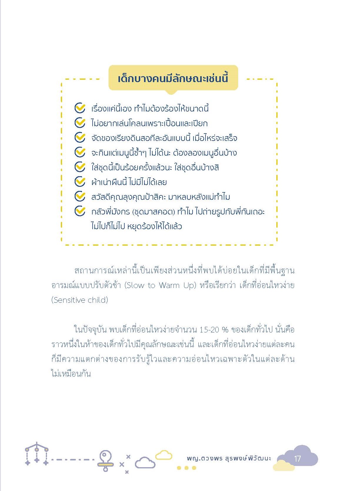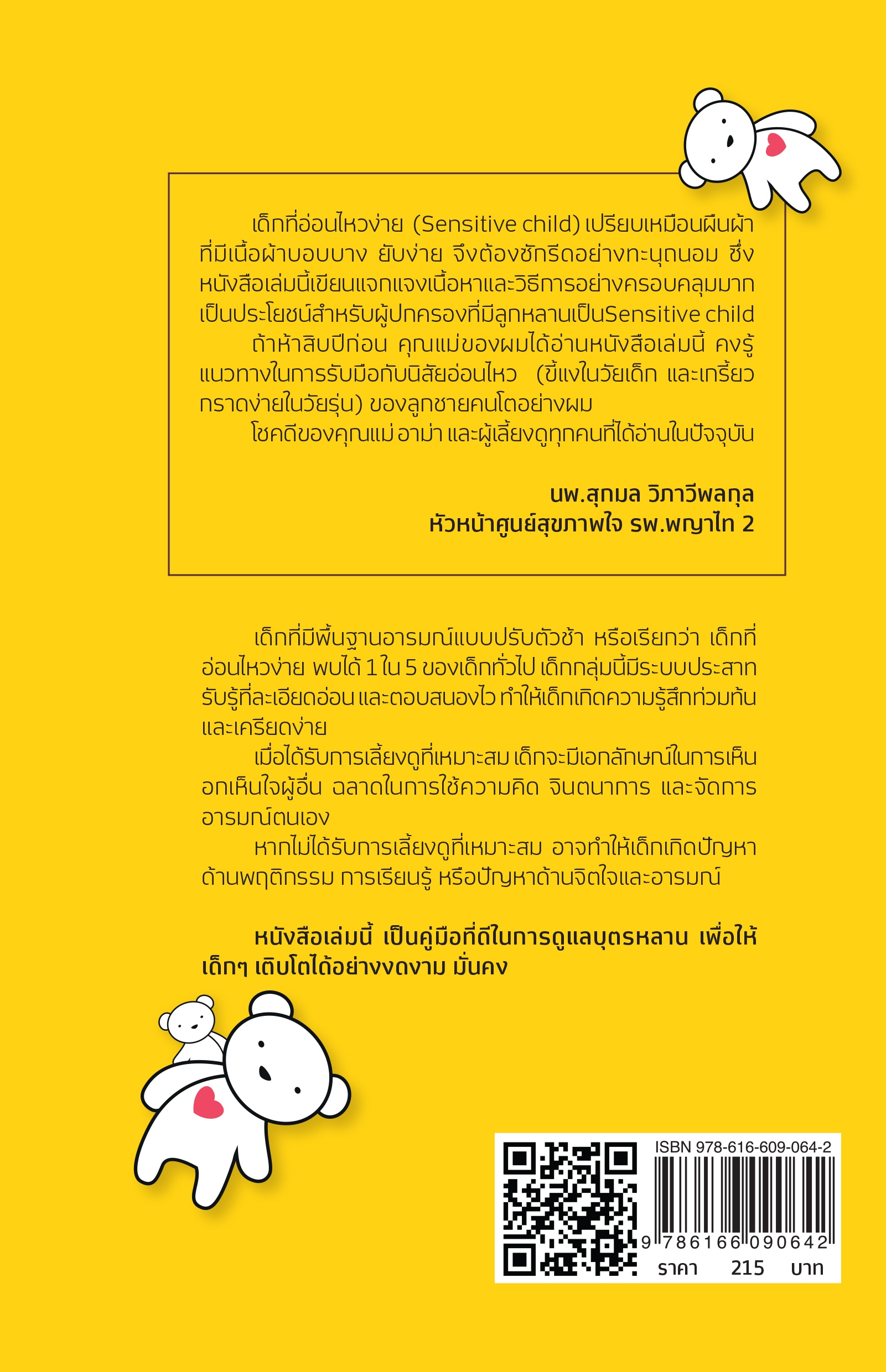 หนังสือเล่มนี้ คุณหมอตวงพร สุรพงษ์พิวัฒนะ" เรียบเรียงขึ้นเพื่อเป็นคู่มือให้กับคุณพ่อคุณแม่ หรือผู้เลี้ยงดู ได้นำความรู้ไปประยุกต์หรือปรับใช้เพื่อการดูแลน้องๆ ให้เหมาะสม ลดปัญหาอันอาจจะเกิดจากความไม่เข้าใจของผู้เลี้ยงดูกับเด็ก และช่วยให้เด็กเติบโตได้อย่างสวยงาม คำแนะนำดีๆ เพื่อคุณพ่อ คุณแม่ หรือผู้ปกครอง ในการเลี้ยงดูเด็กที่อ่อนไหวง่ายอย่างถูกต้อง เพื่อการเติบโตเป็นพลังที่สร้างสรรค์ต่อไปในอนาคต ![]() ![]() ![]() ![]() ![]() ![]() ![]() ![]() ![]() ![]() ![]() ![]() ![]() ![]() ![]() ![]() |