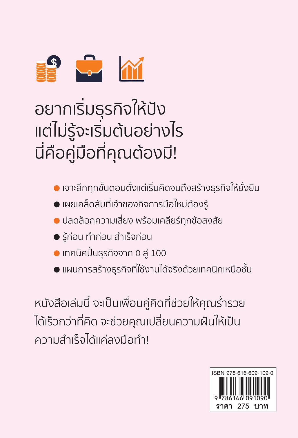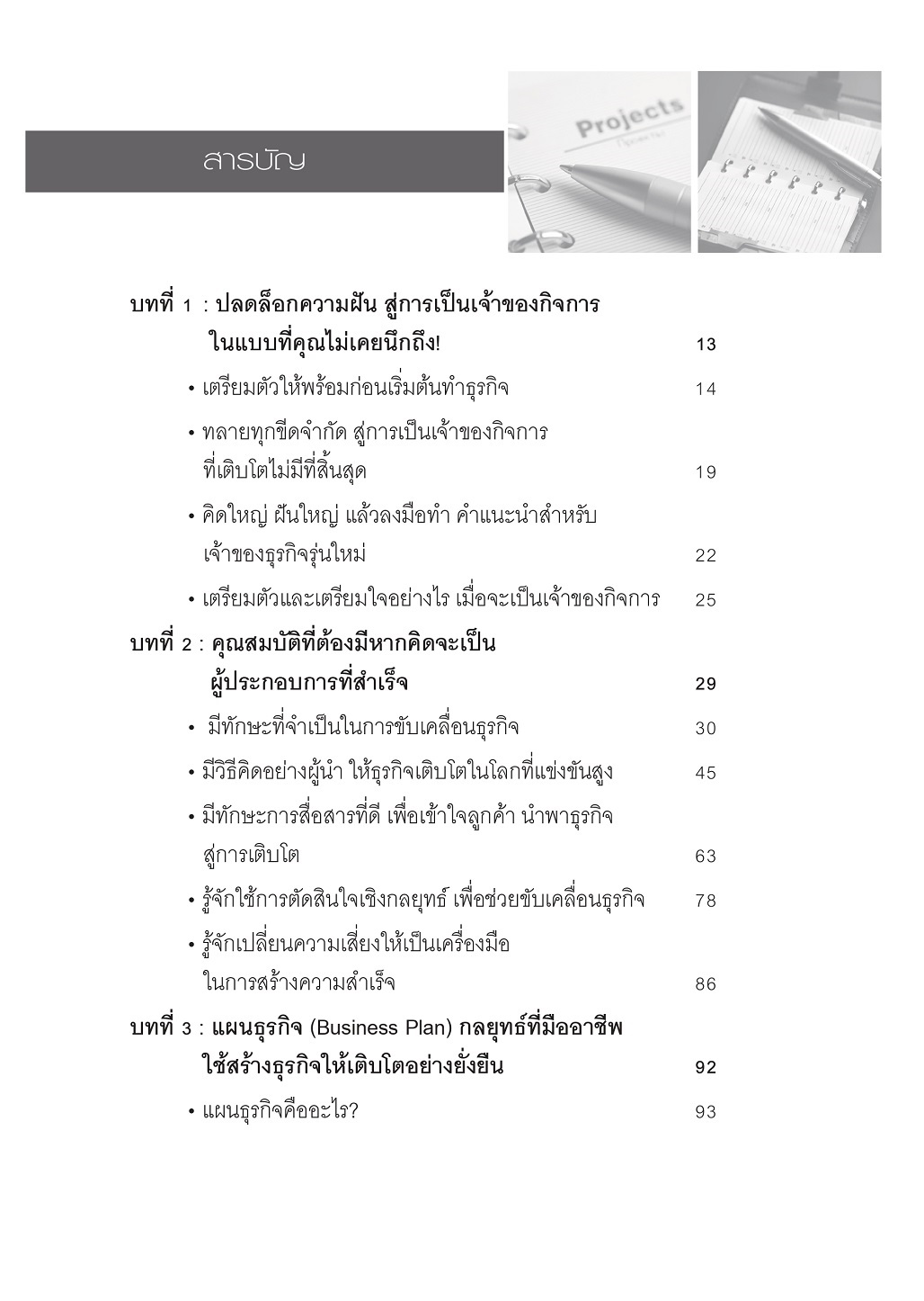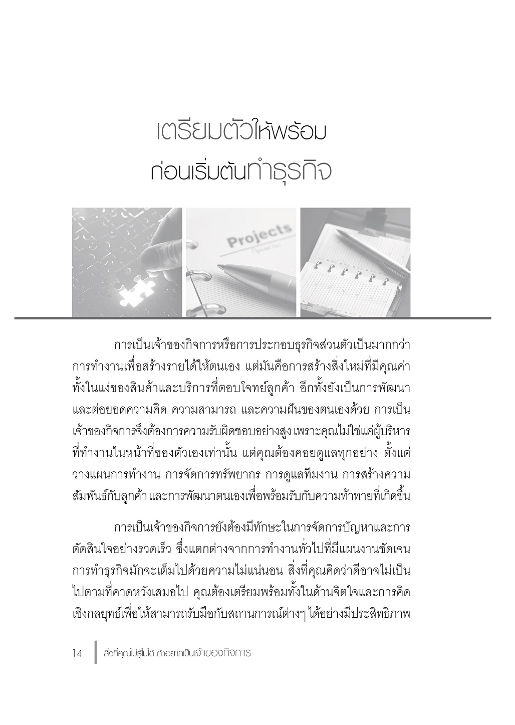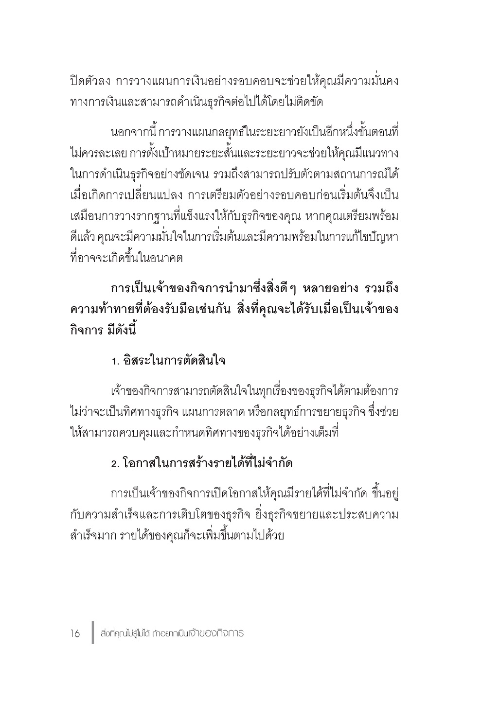 พบกับแนวคิดสำคัญที่เจ้าของกิจการต้องรู้  ไม่ว่าจะเป็นการวางแผนกลยุทธ์  การบริหารจัดการการเงิน  การสร้างทีมงานที่มีคุณภาพ  และอื่นๆที่น่าสนใจ ซึ่งไม่ว่าคุณจะเป็นคนที่เริ่มต้นใหม่จากศูนย์  หรือกำลังหาทางพัฒนาธุรกิจที่มีอยู่แล้ว  หนังสือเล่มนี้จะช่วยเตรียมพร้อมให้คุณมองเห็นความท้าทายต่างๆ  เป็นแรงผลักดัน และใช้มันเป็นก้าวสำคัญสู่ความสำเร็จที่คุณตั้งเป้าไว้