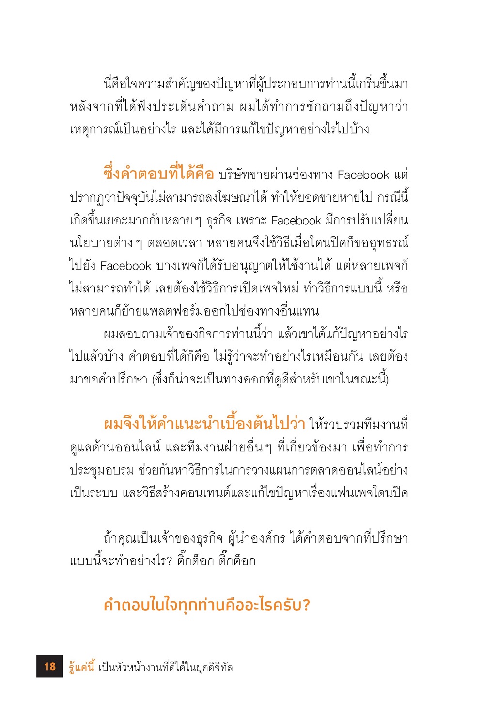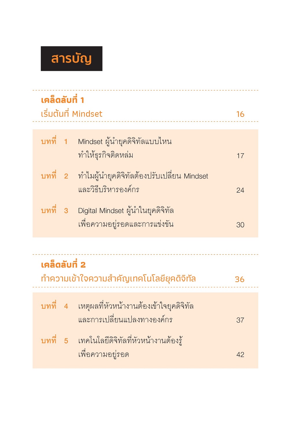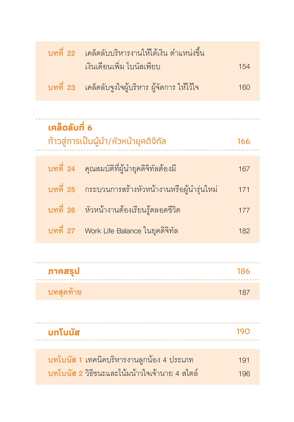 หนังสือเล่มนี้ ถูกเขียนด้วยความตั้งใจที่จะแบ่งปันความรู้ ประสบการณ์ และวิธีการที่ได้เรียนรู้และใช้ในการฝึกฝนหัวหน้างานและผู้นำในองค์กรต่างๆ ผ่านทางบทความทั้ง 27 บทที่เต็มไปด้วยข้อมูลและเทคนิคต่างๆ เราจะเดินทางไปด้วยกันเพื่อร่วมกันค้นหาทักษะที่จำเป็น การพัฒนาตนเอง การสร้างภาวะผู้นำ การสร้างและบริหารทีม และการสร้างแรงบันดาลใจให้กับทีมในยุคของการเปลี่ยนแปลงที่รวดเร็วนี้ ทุกบทในหนังสือเล่มนี้ถูกออกแบบมาเพื่อไม่เพียงแต่จะให้ความรู้เท่านั้น แต่ยังให้ข้อมูลเชิงปฏิบัติที่คุณสามารถนำไปใช้ใช้ได้จริง เพื่อเตรียมพร้อมสำหรับการเป็นผู้นำที่มีความเข้าใจ และสามารถนำพาองค์กรผ่านยุคสมัยที่เปลี่ยนแปลงไป นอกจากนี้ยังมุ่งหวังว่าจะช่วยให้คุณสามารถสร้างความสมดุลระหว่างชีวิตส่วนตัวและการงานได้อย่างมีความสุขและมีประสิทธิผล ![]() ![]() ![]() ![]() ![]() ![]() ![]() ![]() ![]() ![]() ![]() ![]() ![]() ![]() ![]() ![]() |