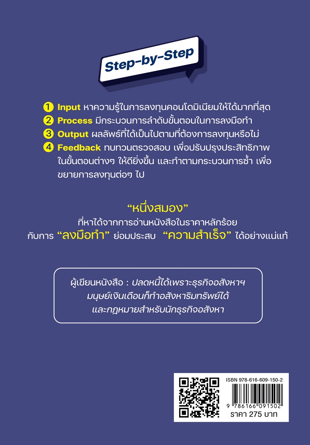 หนังสือเล่มนี้ได้รวบรวมขึ้นจากประสบการณ์การลงทุนคอนโดมิเนียมปล่อยเช่า โดยคำนึงถึงอาชีพรับราชการหรือมนุษย์เงินเดือน ฐานเงินเดือน ความรู้ในด้านการลงทุนอสังหาริมทรัพย์ ระยะเวลาในการลงมือทำ เนื่องด้วยการทำธุรกิจหรือการลงทุนในอสังหาริมทรัพย์มีหลากหลายรูปแบบให้เลือก แต่การลงทุนนั้นย่อมมีความเสี่ยง ดังนั้นผมจึงเลือกวิธีการลงทุนด้วยทุน 0 บาท เป็นหลักคิดและลงมือทำในที่สุด การทำธุรกิจเกี่ยวกับอสังหาริมทรัพย์ ผู้ลงทุนควรศึกษาและหมั่นเรียนรู้ให้เข้าใจเป็นอย่างดี จึงจะสามารถนำไปประกอบอาชีพที่เกี่ยวข้องกับการทำธุรกิจอสังหาริมทรัพย์ได้ การลงทุนในคอนโดมิเนียมปล่อยเช่าก็เช่นเดียวกัน จึงได้รวบรวมแนวคิดและวิธีทำคอนโดมิเนียมปล่อยเช่า ในสไตล์ของมนุษย์เงินเดือนและการลงทุนโดยใช้เงิน 0 บาทไปพร้อมกัน ซึ่งทำได้จริงและมีรายได้เพิ่มขึ้นจากงานประจำที่ทำอยู่ ![]() ![]() ![]() ![]() ![]() ![]() ![]() ![]() ![]() ![]() ![]() ![]() ![]() ![]() ![]() ![]() |