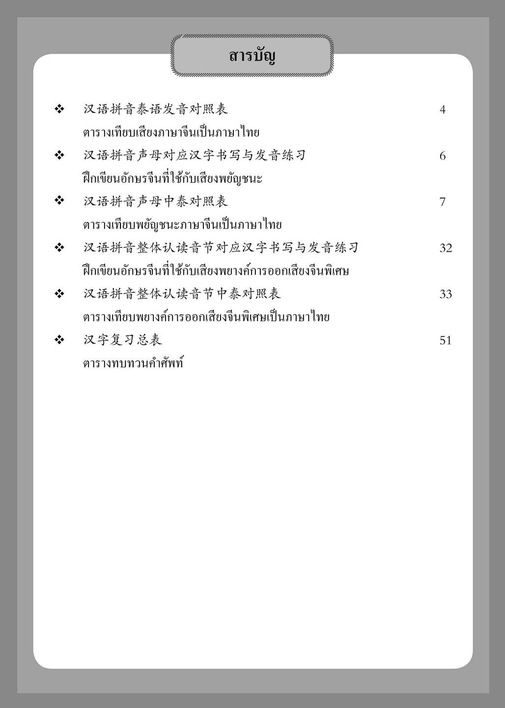หัดเขียน เรียน คัด พยัญชนะและพยางค์พิเศษเล่มนี้ได้รวบรวมพยัญชนะของภาษาจีน 21 รูป เนื่องจากภาษาจีนเป็นภาษาสองระบบ คือ ระบบผันเสียง และ ระบบการเขียนอักษรจีน ฉะนั้น การฝึกเขียนเสียงพยัญชนะภาษาจีน ไม่ใช่เพียงแค่ฝึกออกเสียงอย่างเดียว ต้องมีอักษรรูปภาพประกอบ เพื่อง่ายต่อการทำความเข้าใจ และเรียนรู้ทั้งสองระบบพร้อมกัน