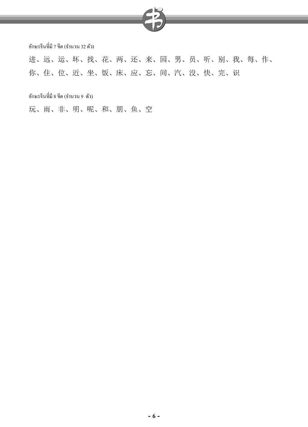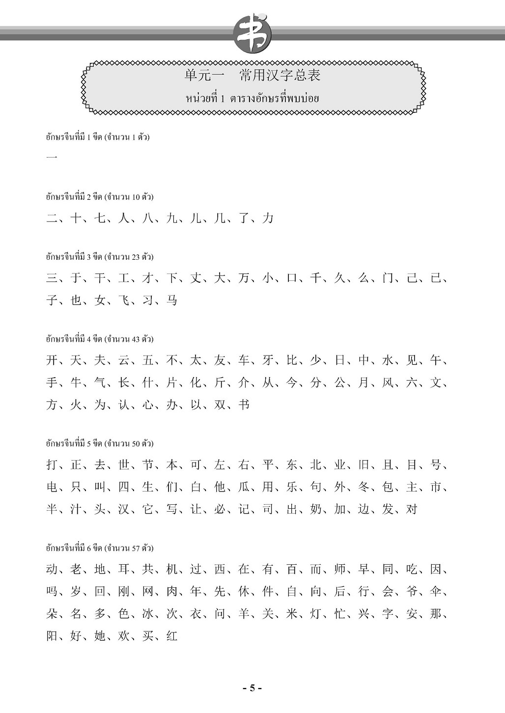 เป็นอักษรจีนขั้นพื้นฐานที่ผู้เรียนภาษาจีนในระดับต้น ควรเขียนและอ่านเป็นรวมทั้งเข้าใจความหมาย นำไปใช้ได้อย่างถูกต้อง
