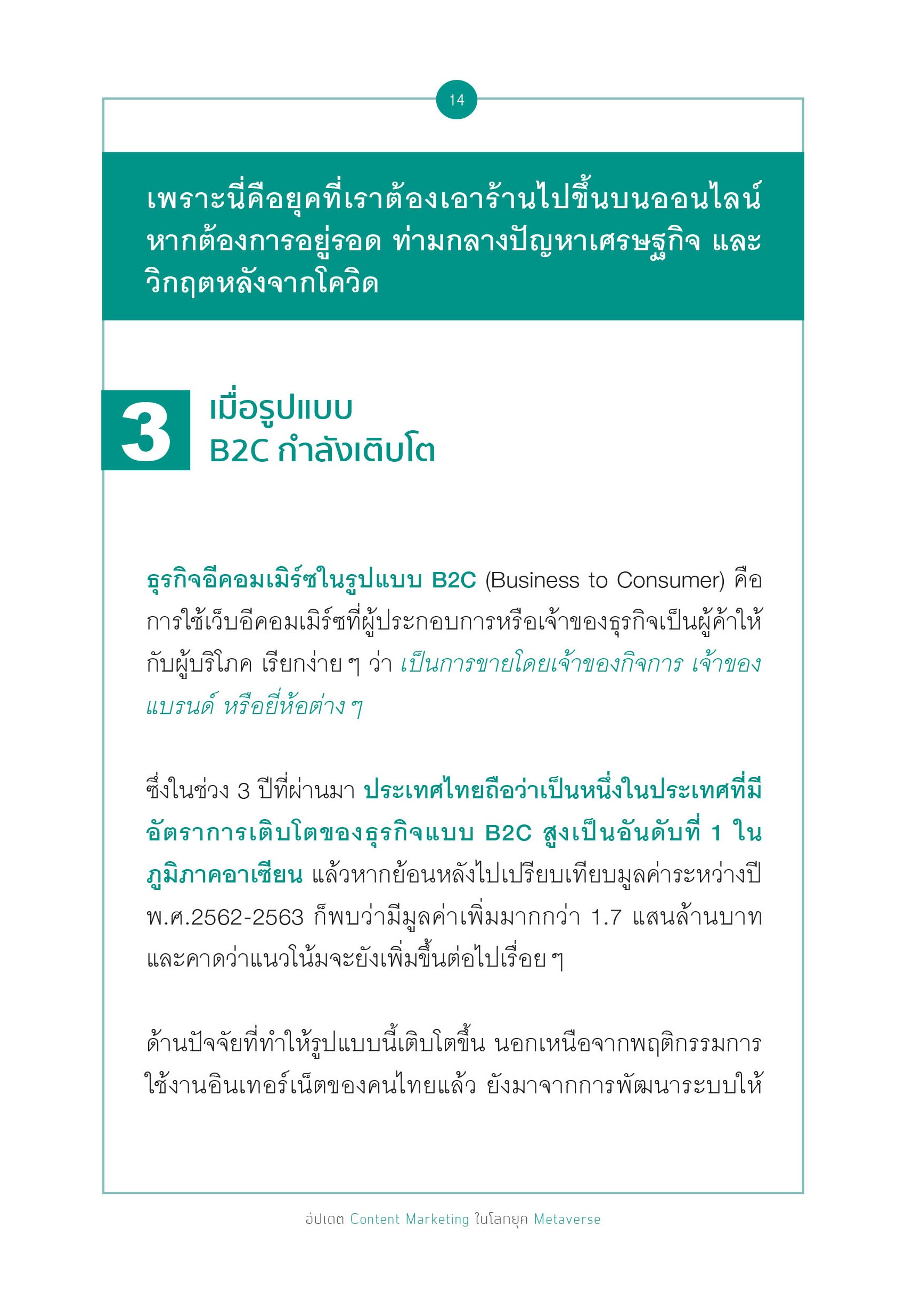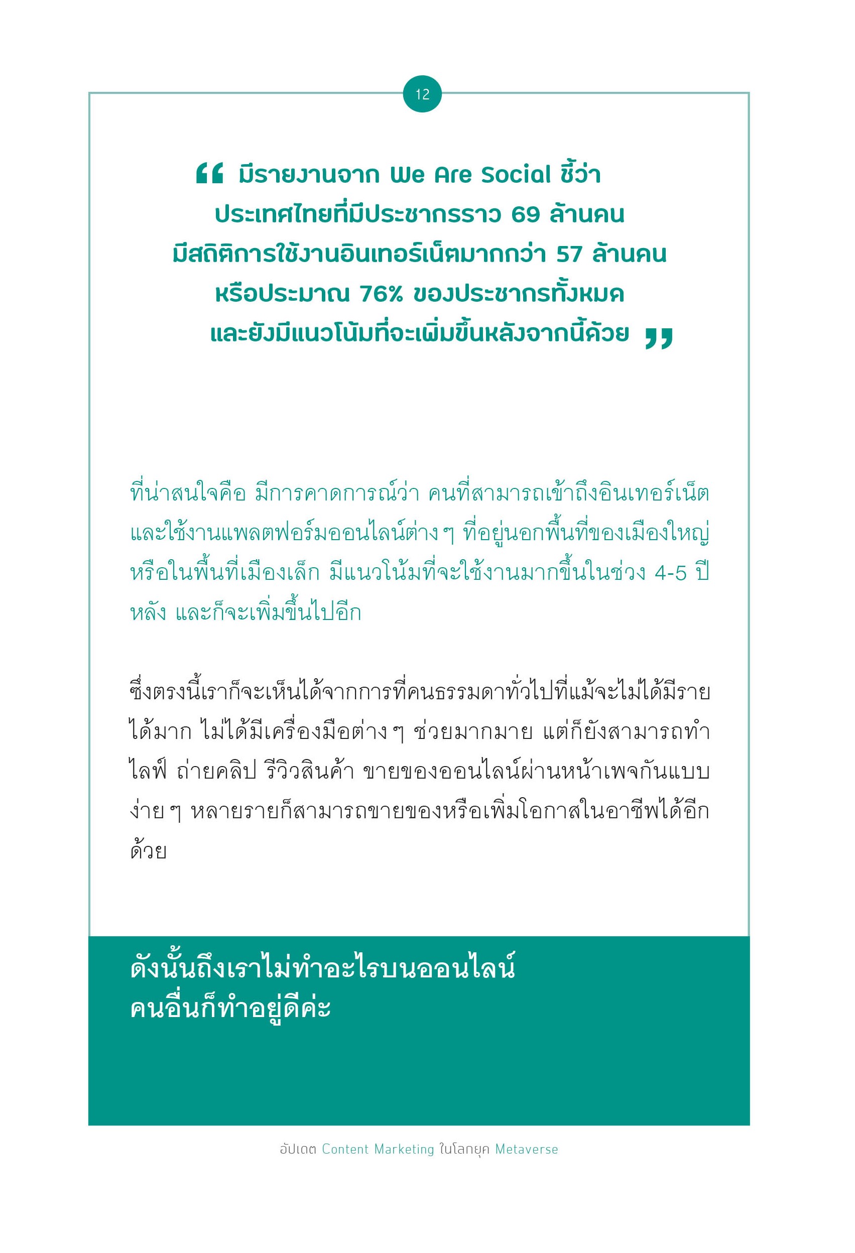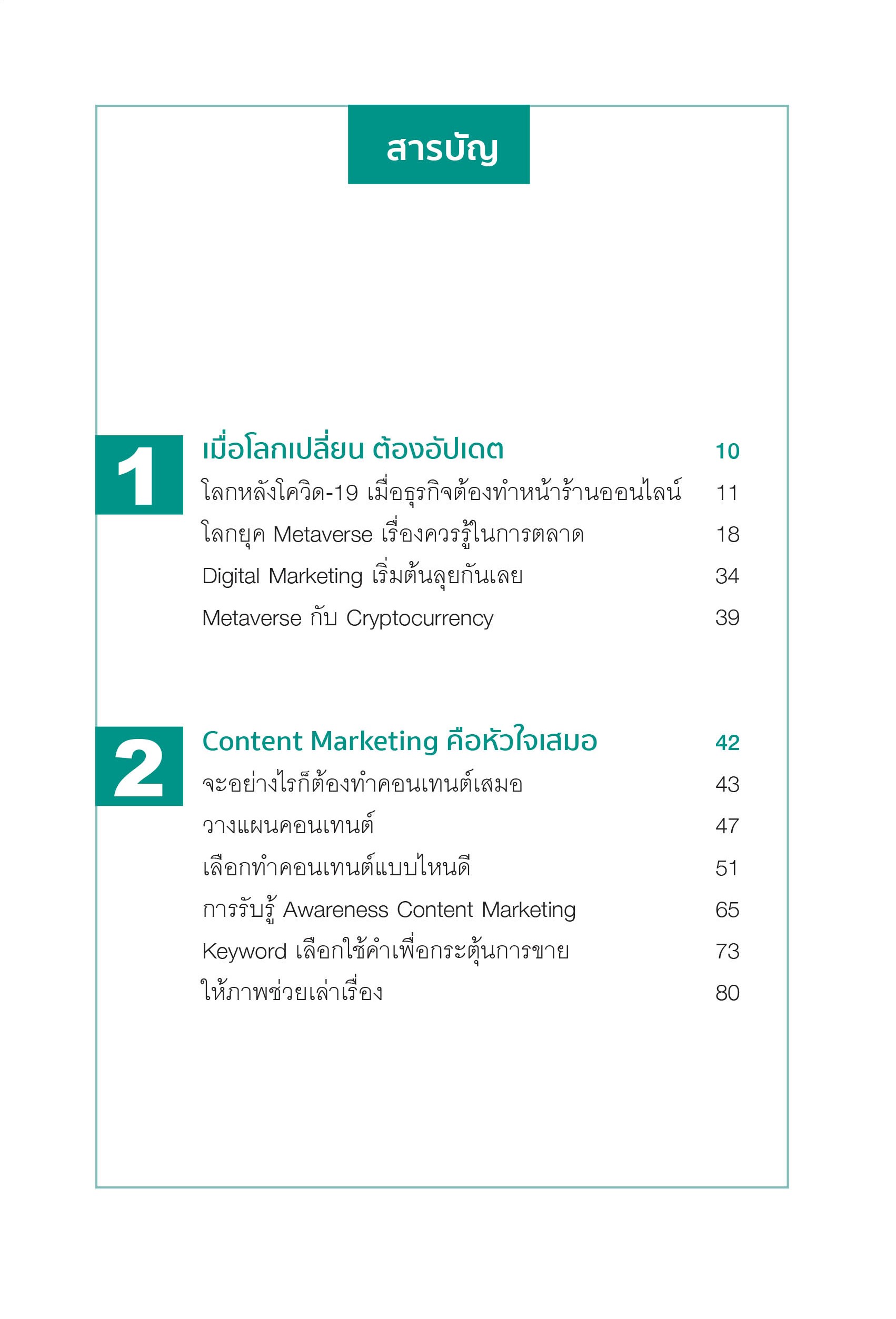 ต้องยอมรับว่า ในเวลานี้คนส่วนใหญ่ต่างก็พูดถึง Metaverse ว่าจะเป็นอนาคตของโลก ซึ่งในความเป็นจริงหลายบริษัททั่วโลกก็เริ่มเข้ามาลุยเรื่องนี้กันมากแล้ว ดูผิวเผินมันอาจเหมือนเป็นเรื่องไกลตัว แต่ที่จริงเราอาจจะเข้าสู่โลกของ Metaverse โดยที่เราไม่รู้ตัวกันอยู่แล้วก็ได้ แล้วในเมื่อโลกเรากำลังเข้าสู่ยุคของ Metaverse แล้วมีอะไรบ้างที่เราควรอัปเดตเพื่อให้เข้าใจการตลาดในโลกของ Digital Marketing รวมถึงการทำ Content Marketing ผ่านเครื่องมือออนไลน์แพลตฟอร์มต่างๆ ไม่ว่าจะเป็น Facebook Google Instagram Youtube และเครื่องมืออื่นๆ ซึ่งจะเป็นเรื่องสำคัญที่อยู่คู่กับชีวิตและการทำงานของเราในโลกหลังจากนี้ เพราะเวลานี้แบรนด์และธุรกิจในโลกต่างก็อัปเดตกันไปมากแล้ว เชื่อว่าหนังสือเล่มนี้ จะเปลี่ยนชีวิตผู้คนที่ชอบการทำงานออนไลน์ได้แน่นอน ![]() ![]() ![]() ![]() ![]() ![]() ![]() ![]() ![]() ![]() ![]() ![]() ![]() ![]() ![]() ![]() |
