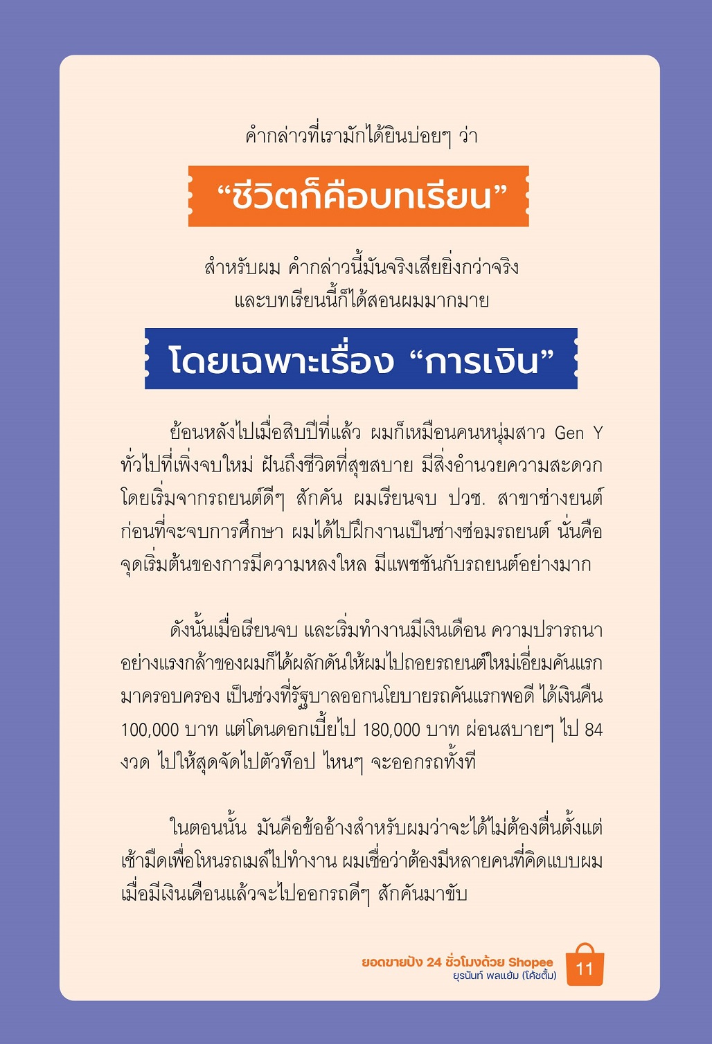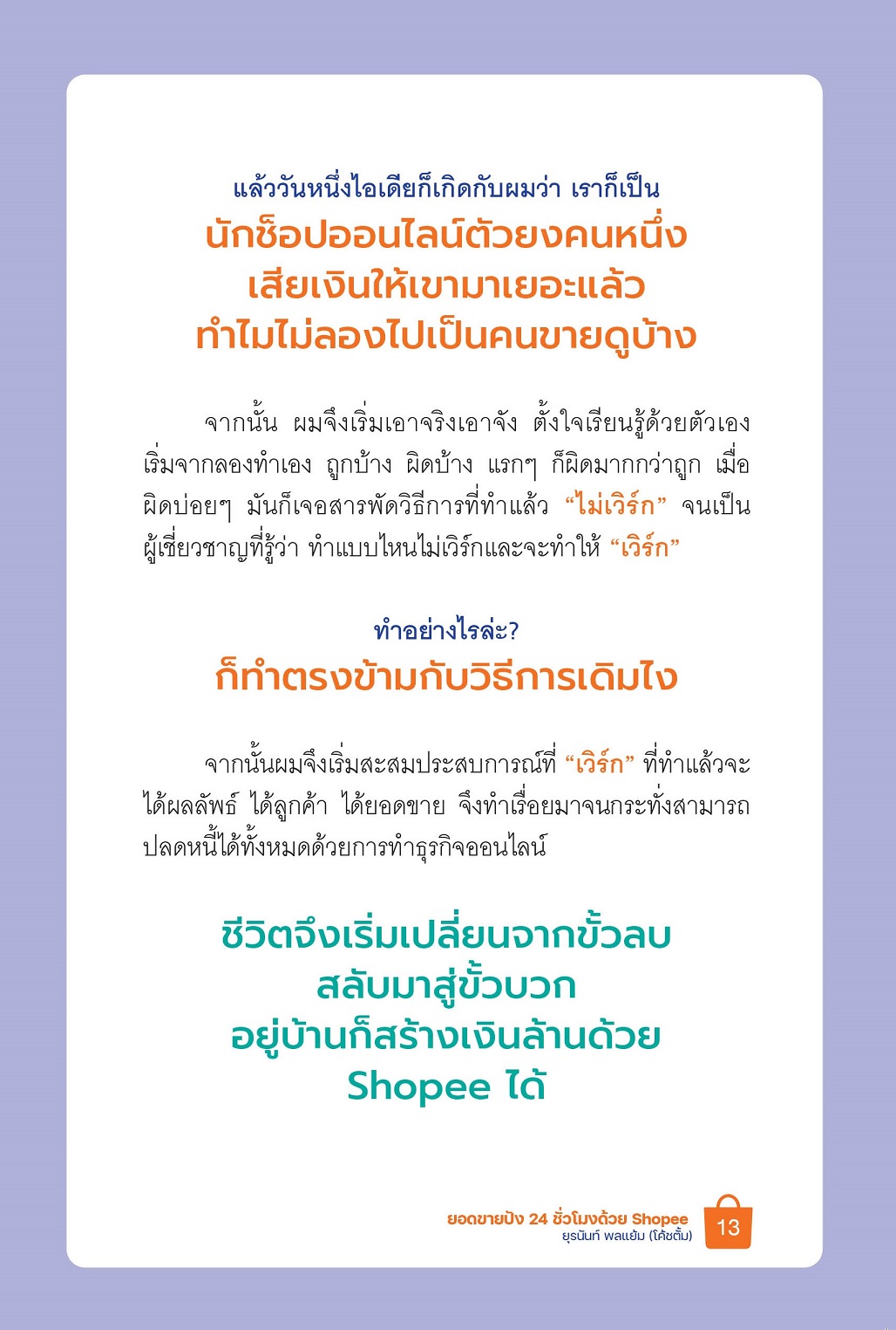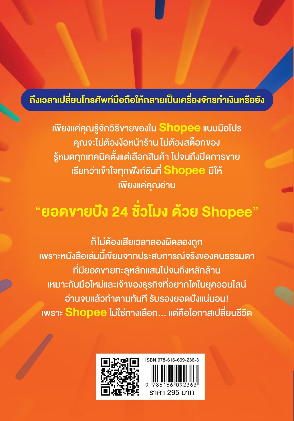 ในวันที่โลกหมุนเร็วกว่าเดิม ความไม่แน่นอนกลายเป็นเรื่องธรรมดา เศรษฐกิจตกต่ำไม่ว่าจะเป็นเศรษฐกิจไทยหรือเศรษฐกิจโลกการแข่งขันที่สูงมากขึ้น ค่าครองชีพที่สูงมากขึ้น ทุนจีนหลากหลายระดับรุกคืบเข้ามามากขึ้น AI เข้ามามีบทบาทมากขึ้นในชีวิตประจำวันและการทำงาน “โลกออนไลน์ไม่ใช่ทางเลือก แต่คือทางรอด” หนังสือเล่มนี้จึงไม่ใช่แค่ “คู่มือการขายของใน Shopee” แต่มันคือ “เส้นทางเริ่มต้นของคนอยากเปลี่ยนชีวิต” โดยเรียบเรียงให้เข้าใจง่าย