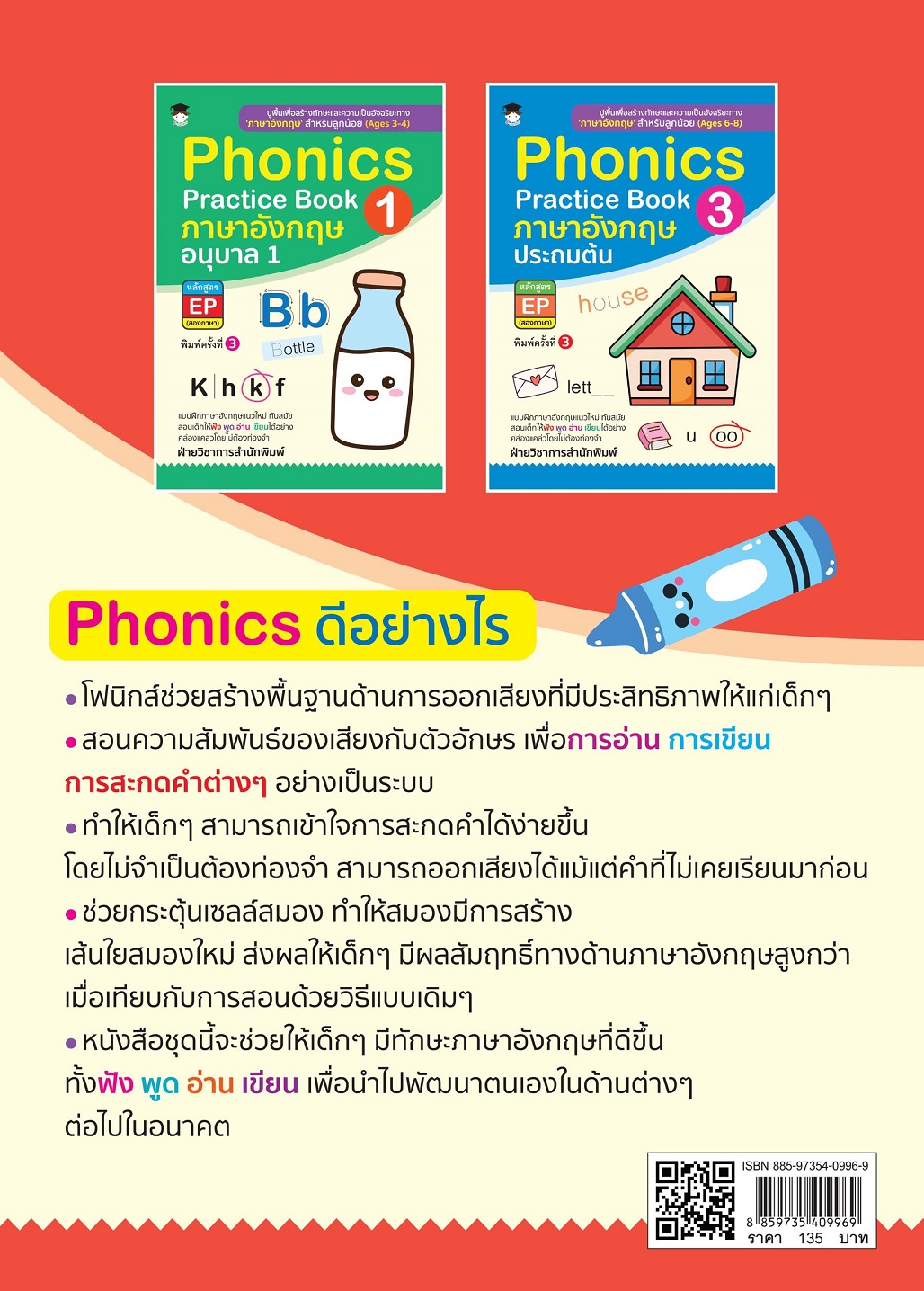 Phonics ดีอย่างไร   โฟนิกส์ช่วยสร้างพื้นฐานด้านการออกเสียงที่มีประสิทธิภาพให้แก่เด็กๆ  สอนความสัมพันธ์ของเสียงกับตัวอักษร เพื่อการอ่านการเขียน การสะกดคำต่างๆ อย่างเป็นระบบ ทำให้เด็กสามารถเข้าใจการสะกดคำได้ง่ายขึ้น โดยไม่จำเป็นต้องท่องจำ สามารถออกเสียงได้ แม้แต่คำที่ไม่เคยเรียนมาก่อน ช่วยกระตุ้นเซลล์สมอง ทำให้สมองมีการสร้างเส้นใยสมองใหม่ ส่งผลให้เด็กๆ มีผลสัมฤทธิ์ทางด้านภาษาอังกฤษสูงกว่า เมื่อเทียบกับการสอนด้วยวิธีแบบเดิมๆ หนังสือชุดนี้จะช่วยให้เด็กๆ มีทักษะภาษาอังกฤษที่ดีขึ้น ทั้งฟัง พูด อ่าน เขียน เพื่อนำไปพัฒนาตนเองในด้านต่างๆ ต่อไปในอนาคต